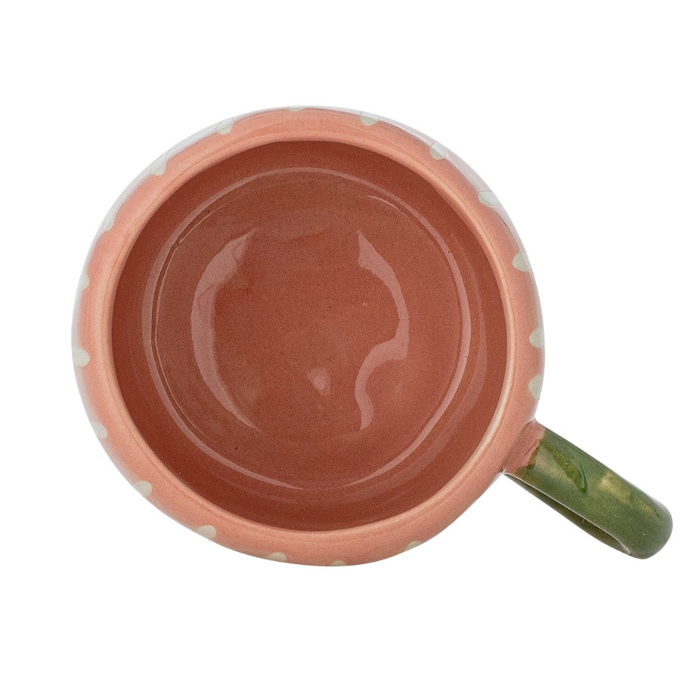 De steengoed mok maakt indruk met een glanzende afwerking en een rond handvat in een contrasterende groene kleur, waardoor hij gemakkelijker vast te houden is voor kleine handjes.