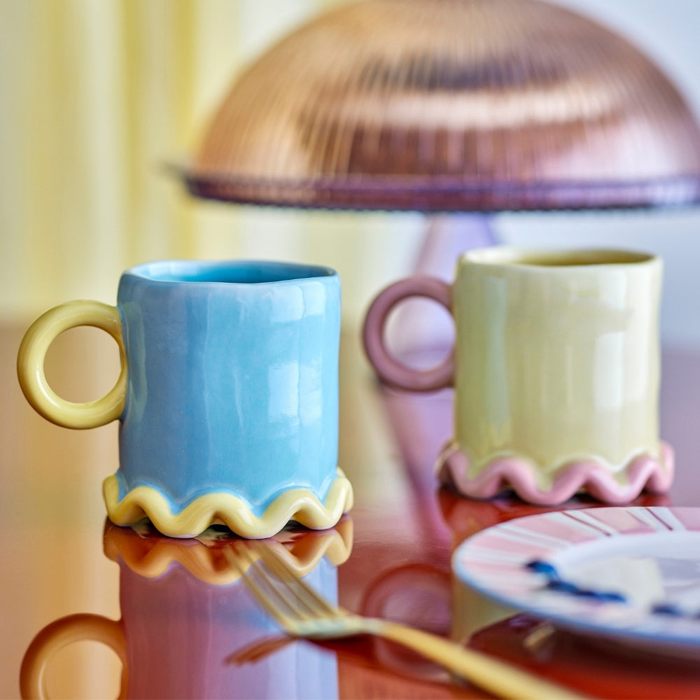 De ene mok is uitgevoerd in een warme tint geel met roze details, de andere in een zacht blauw met gele accenten, wat een harmonieus maar onopvallend paar vormt.
