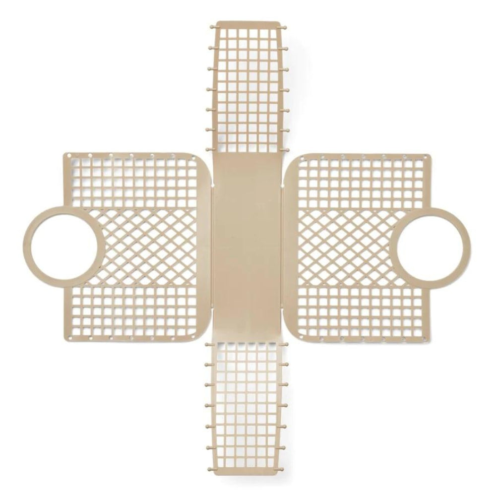 De beige speelgoedmand is gemaakt van 60% gerecycled LPDE en 40% nieuw LPDE.