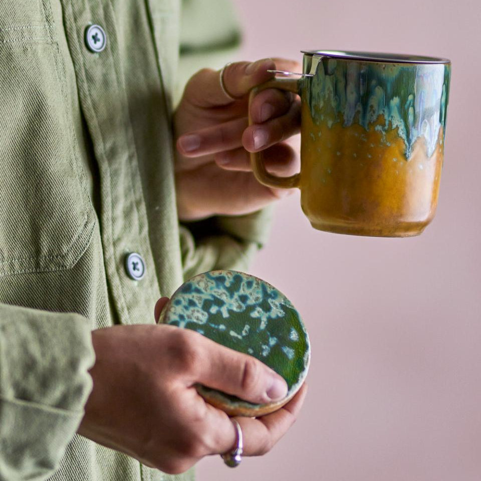 Door het glazuur varieert elke theemok in warme aardetinten en lichte parelmoertinten.