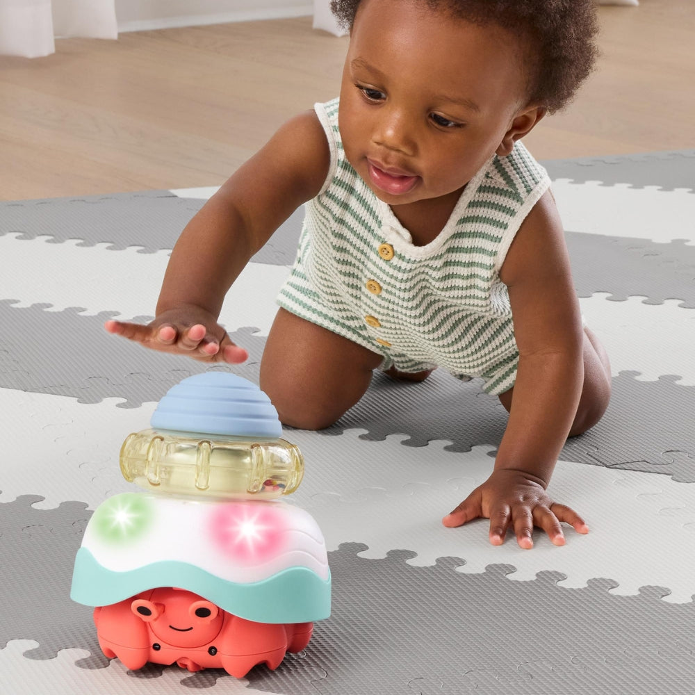 De interactieve krab beweegt vrolijk en steekt onder de schelp uit, wat beginnende kruipers aanmoedigt om te kijken en te reageren.