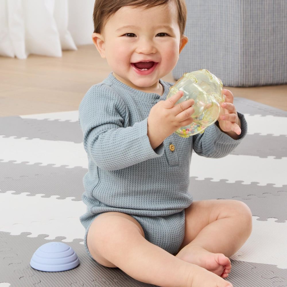 In het beginstadium kan baby de rammelaar en speen gebruiken, voordat hij de stukken gaat sorteren en stapelen.