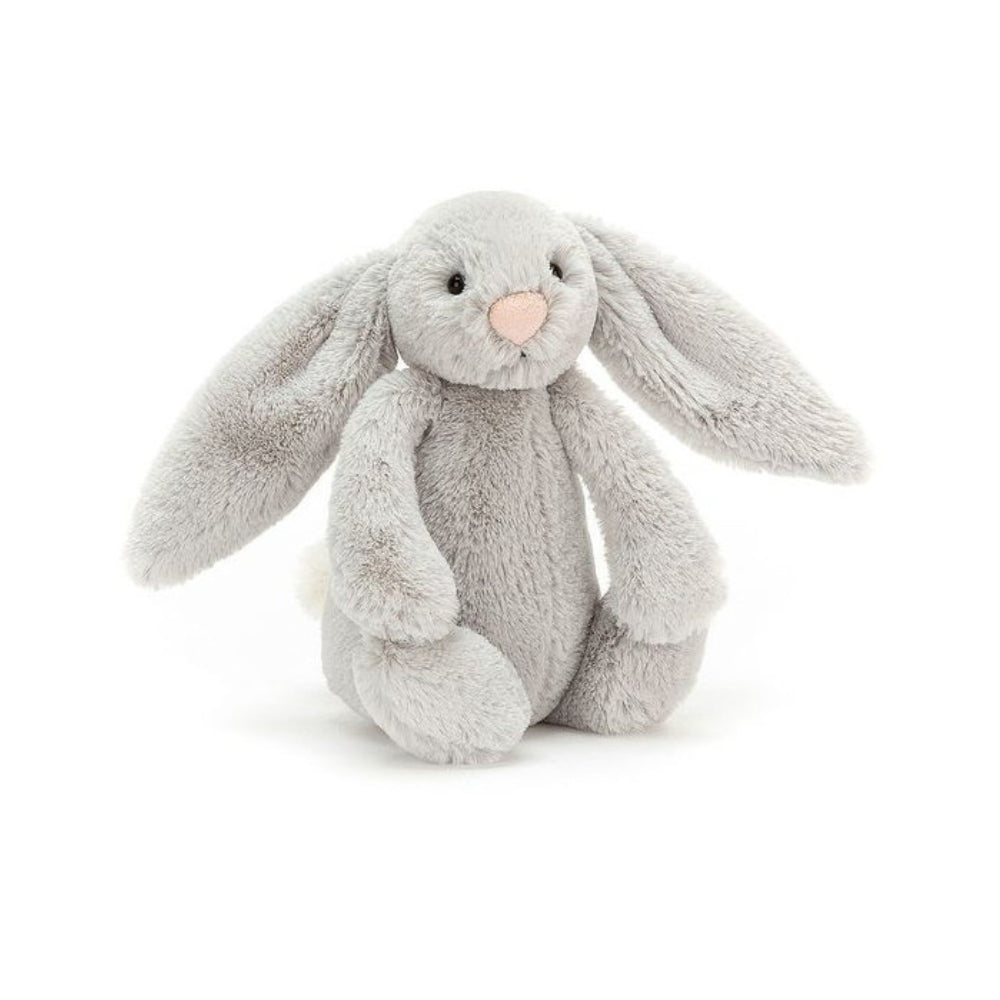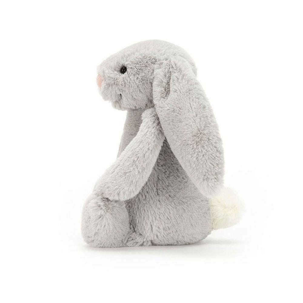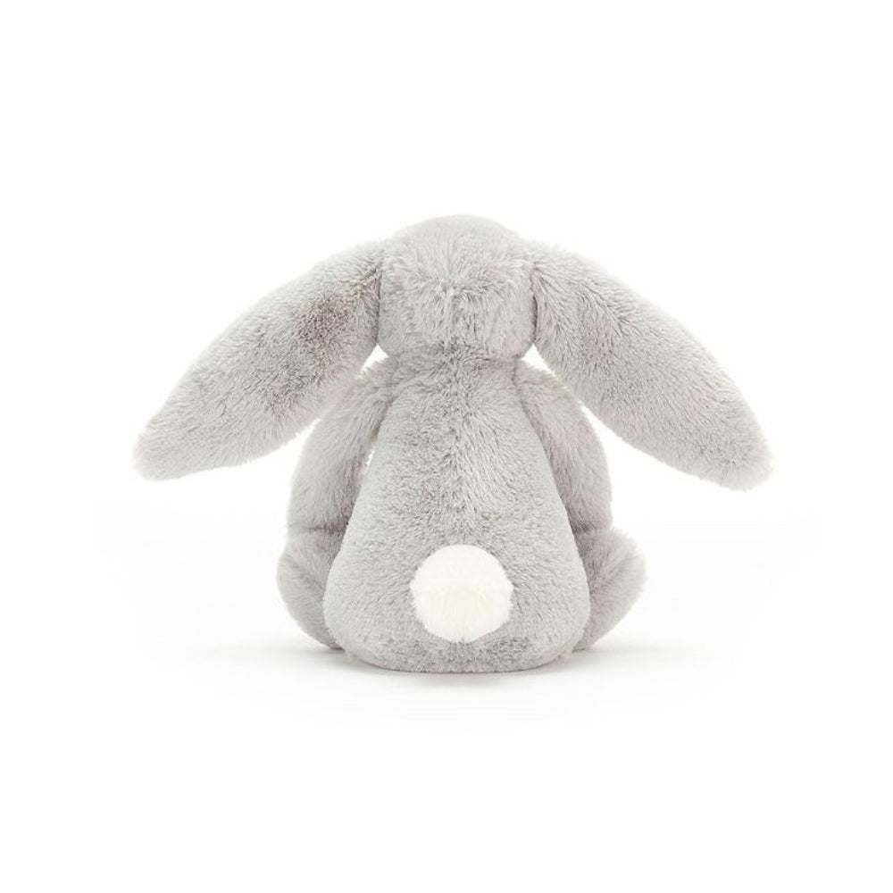 De grijze konijnmascotte van 18 cm van Jellycat is niet alleen een zacht aanvoelende knuffel, maar straalt ook tederheid en charme uit.