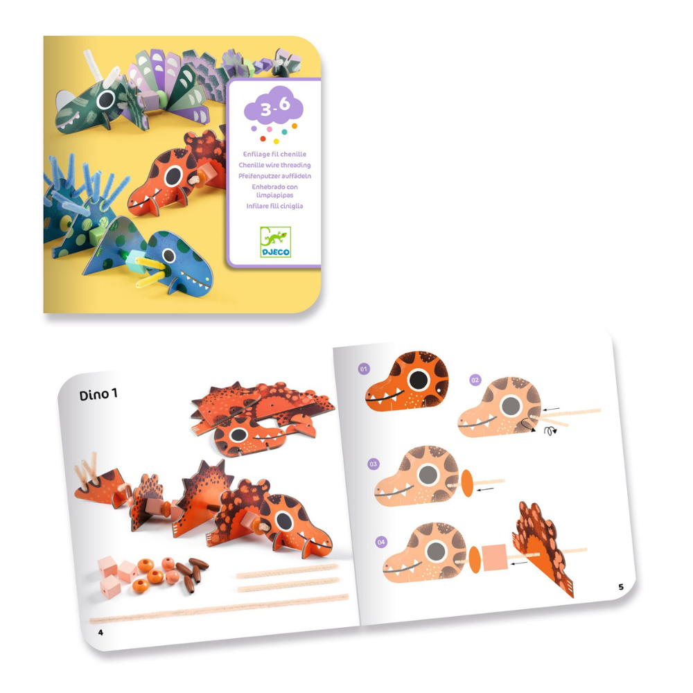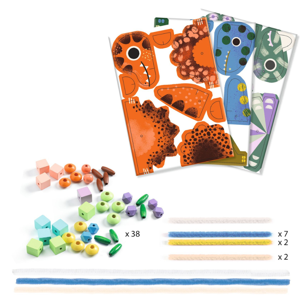 Met deze handmatige set kun je drie schattige dinosaurussen maken door houten kralen en kartonnen stukjes aan kleurrijk creatief draad te rijgen.