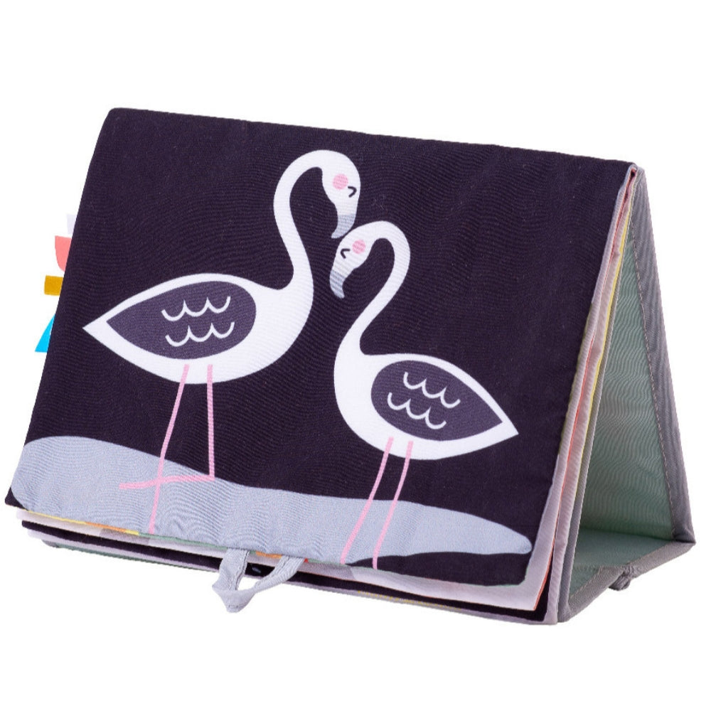 Ein weiches, interaktives Buch von taf toys für Babys, mit zwei Seiten für zwei Entwicklungsstufen, zur Verwendung im Kinderbett, im Kinderwagen und zum Spielen im Bauch.