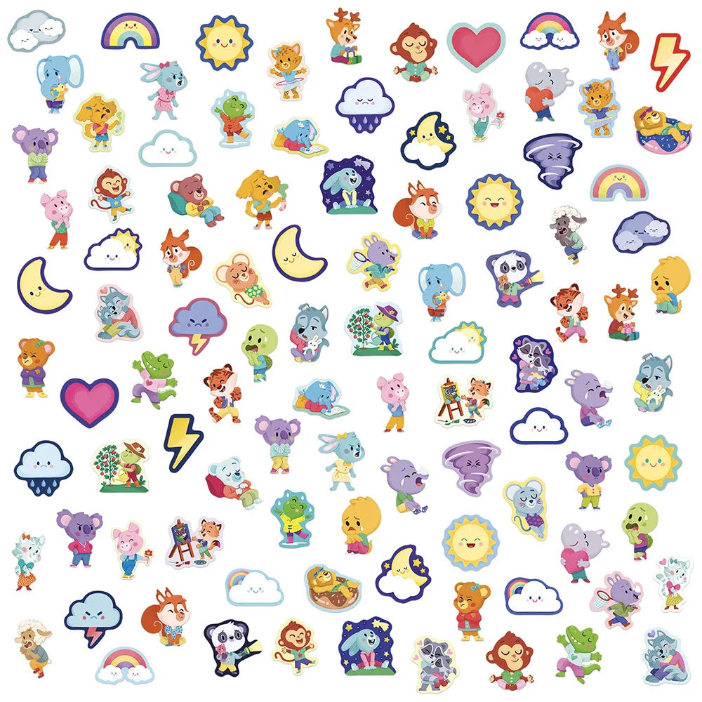 Binnenin wachten dieren en elementen uit de natuur om verschillende emoties te tonen, zoals blijdschap, boosheid, verrassing of verdriet, zodat de stickers je kind helpen om gevoelens te benoemen en ze op hun eigen manier uit te drukken.