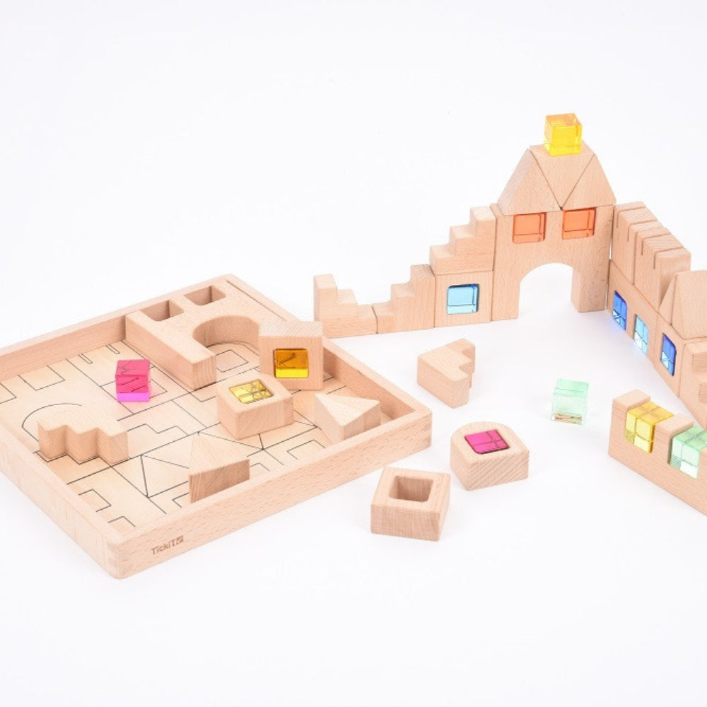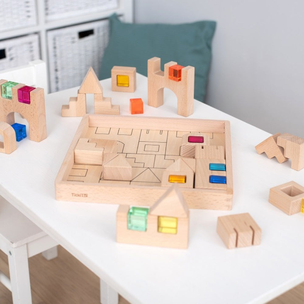 Deze set bestaat uit een verscheidenheid aan gladde houten bouwblokken en kleurrijke juwelenblokjes, verpakt in een stevige houten tray met tabbladen voor eenvoudige organisatie.