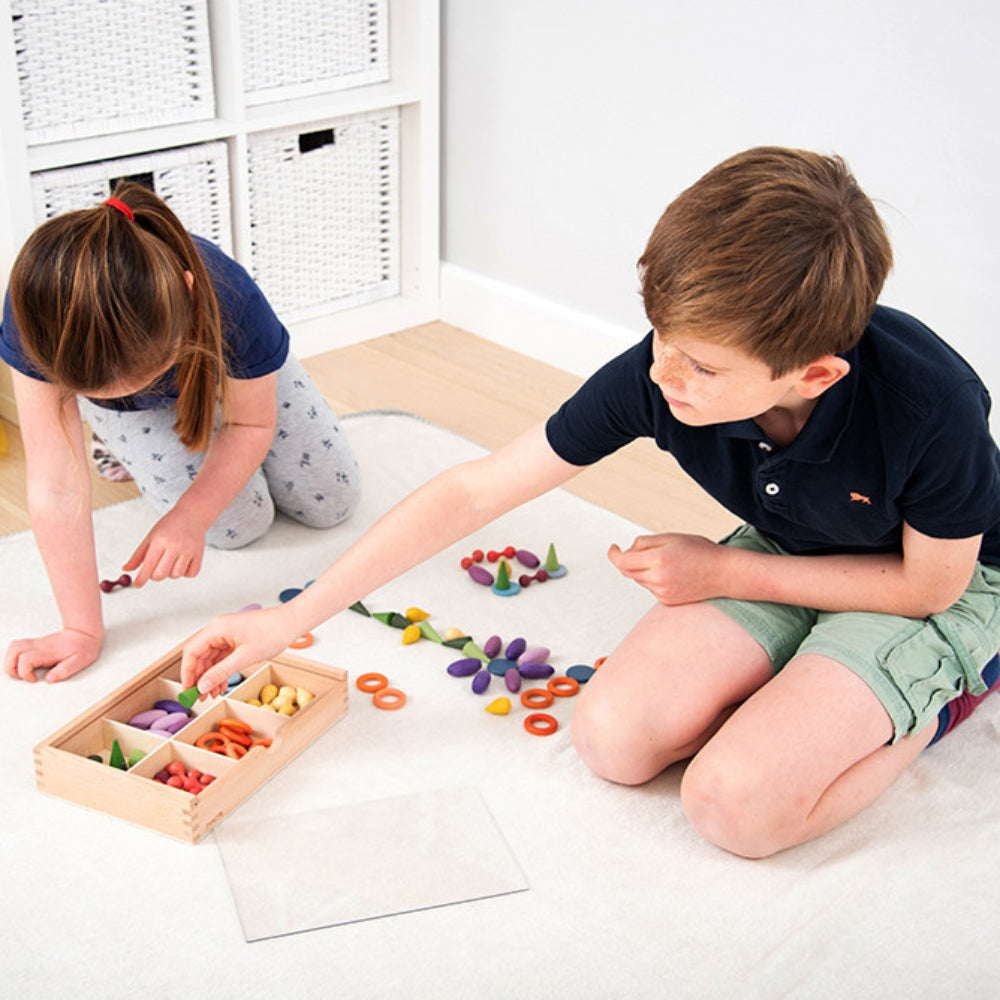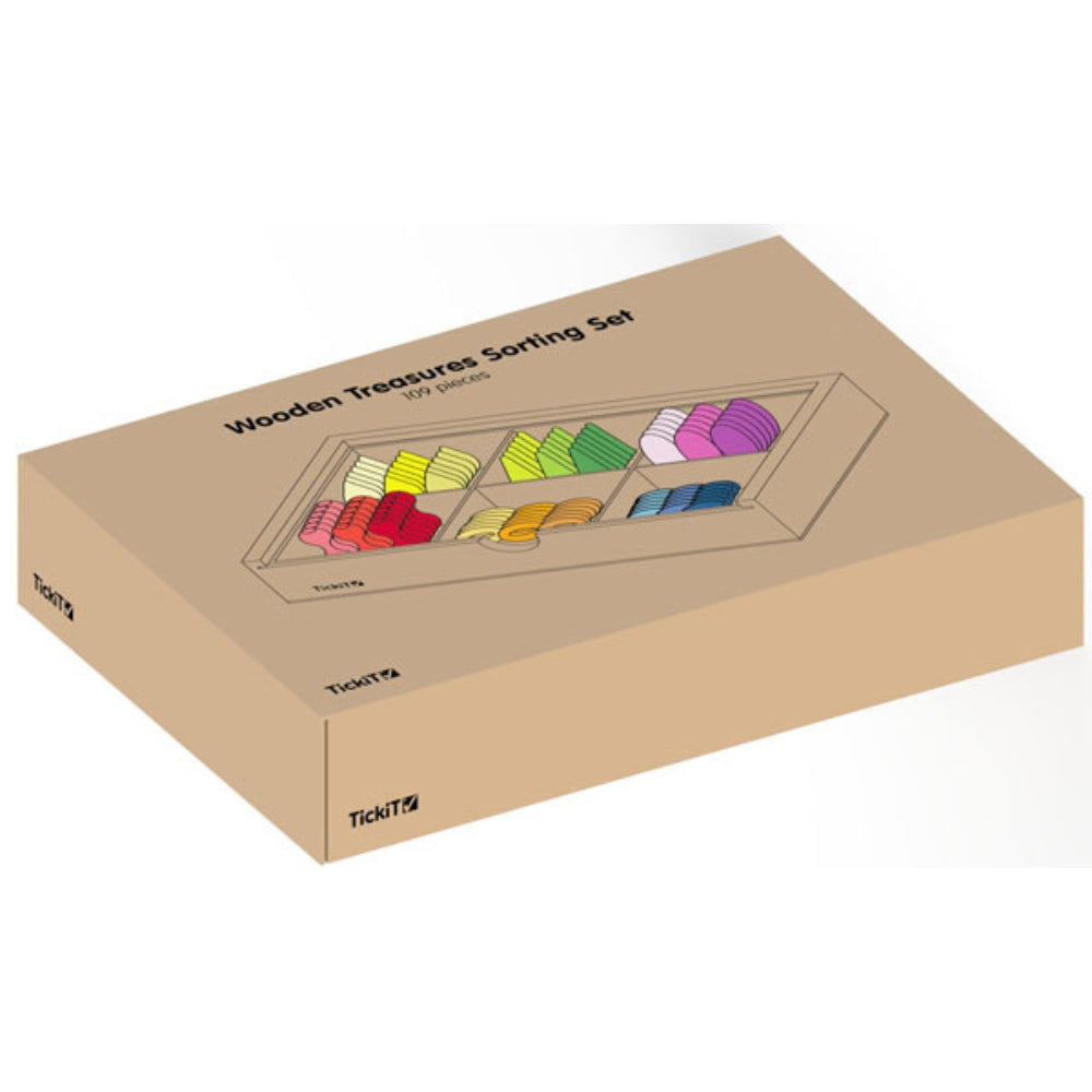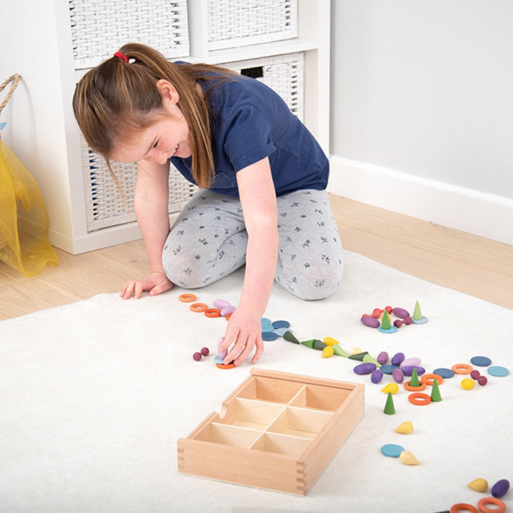 De verzameling speciale gladde houten schatten vormt samen met het houten sorteerblad een inspirerende set die ontworpen is om verbeelding, logica, creatieve vaardigheden, coördinatie en motoriek te ontwikkelen.