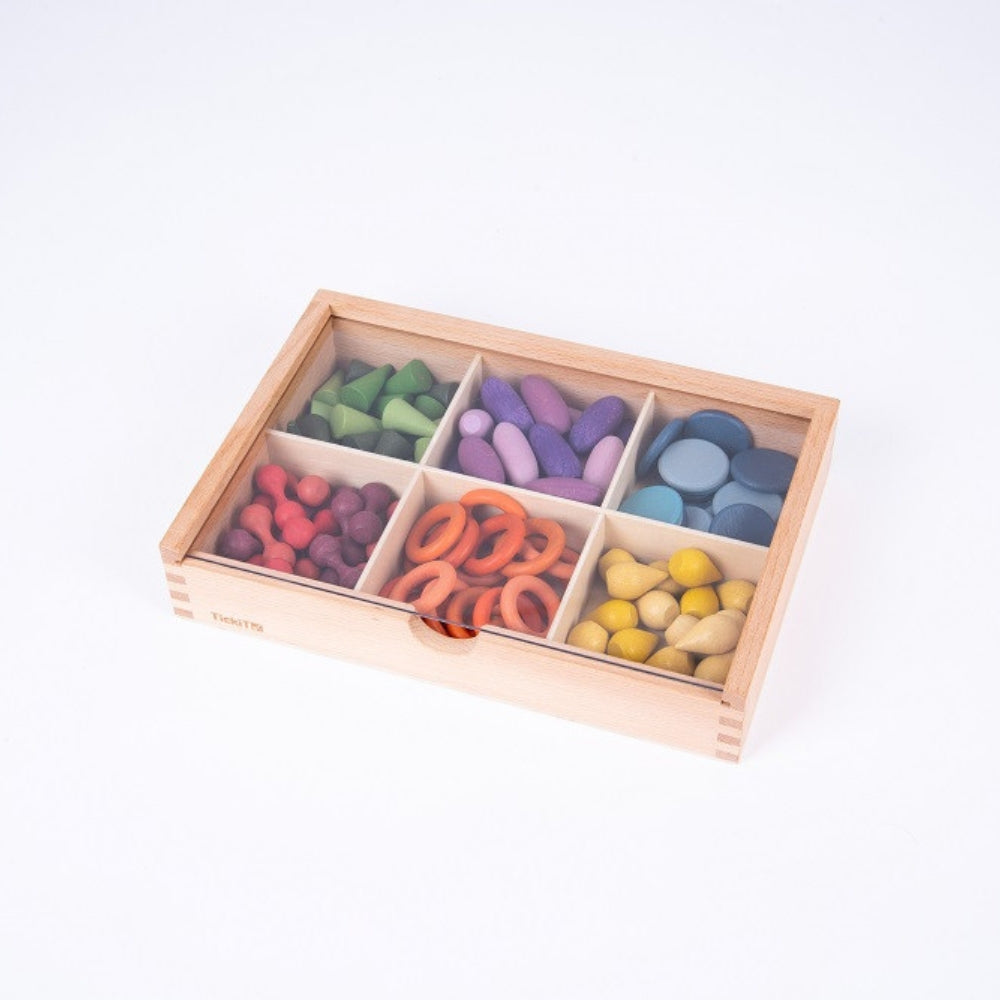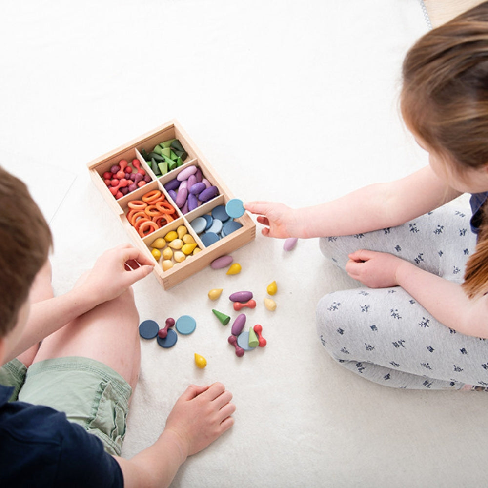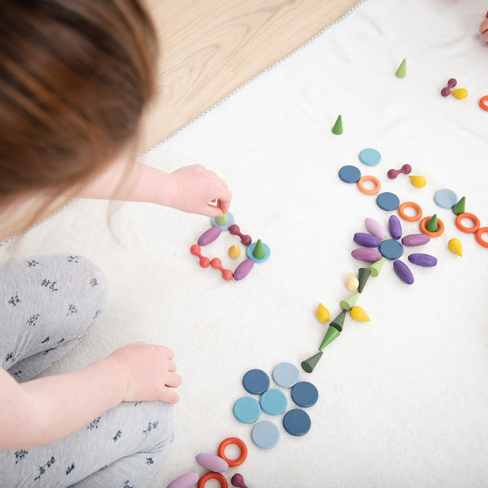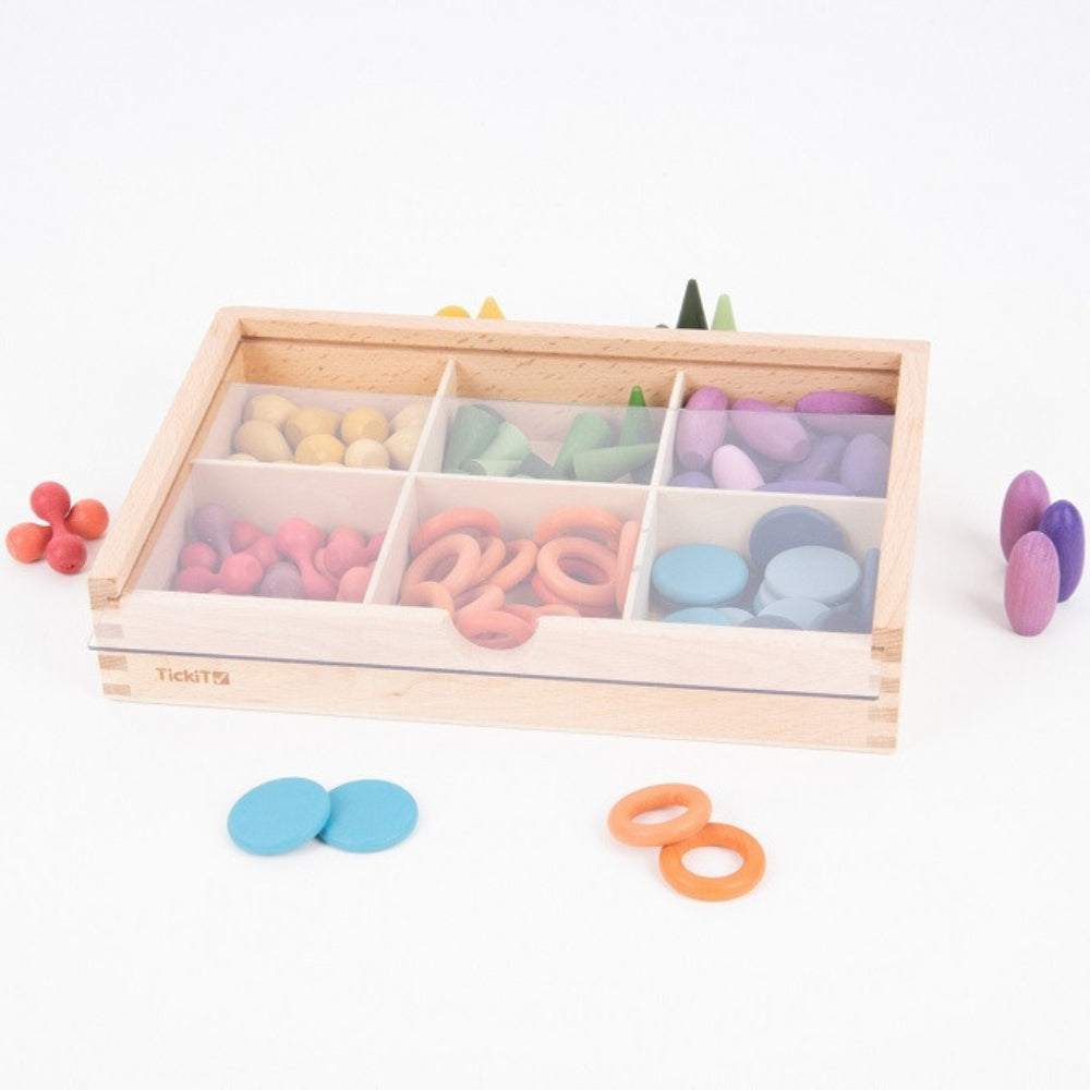 De verzameling speciale gladde houten schatten vormt samen met het houten sorteerblad een inspirerende set die ontworpen is om verbeelding, logica, creatieve vaardigheden, coördinatie en motoriek te ontwikkelen.