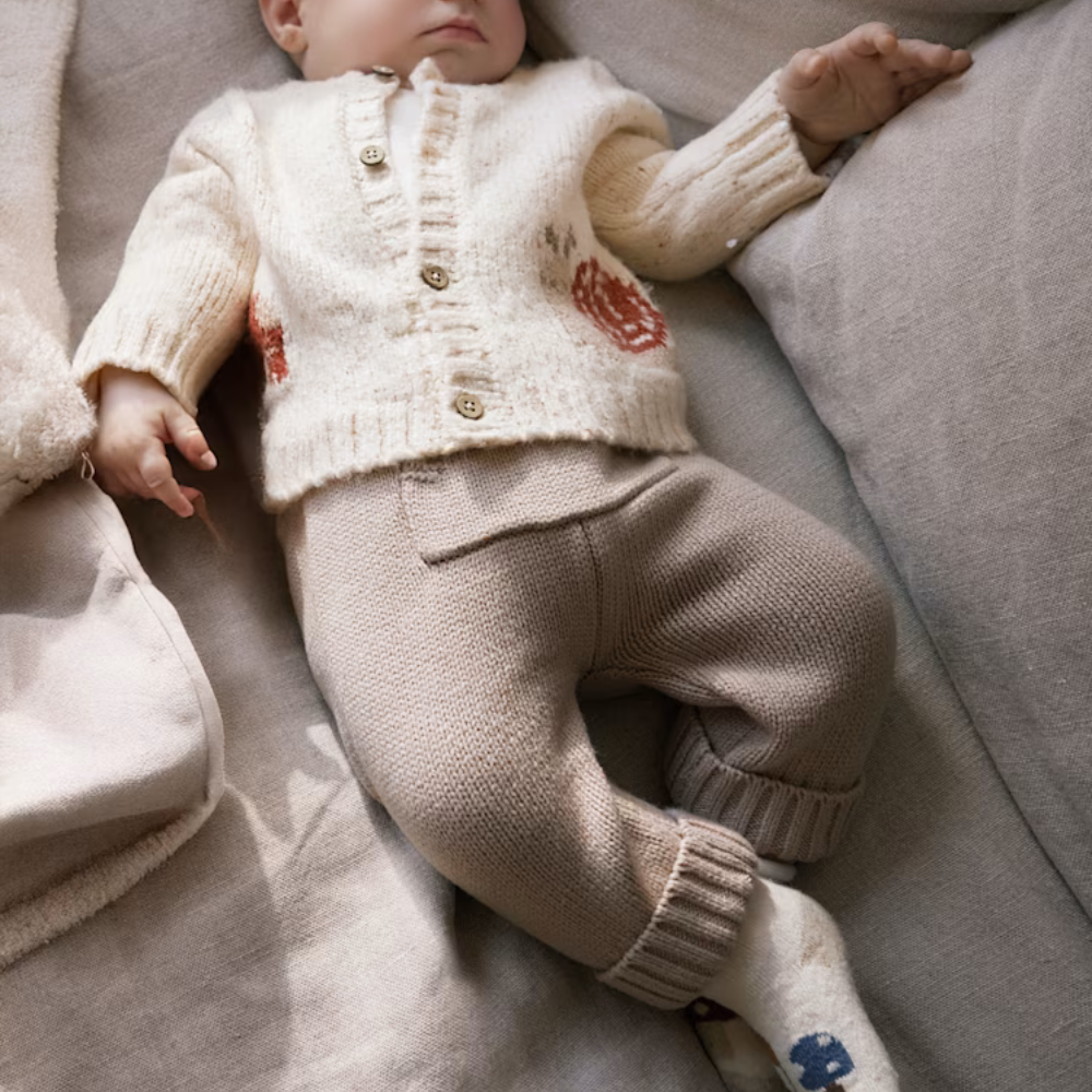 De set bestaat uit een vestje met knoopjes aan de voorkant en charmante jacquardmotieven, een T-shirt met ronde hals en een handige drukknoop bij de hals om gemakkelijk te verschonen, en een broekje met elastische tailleband en een functionele zak aan de voorkant.