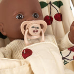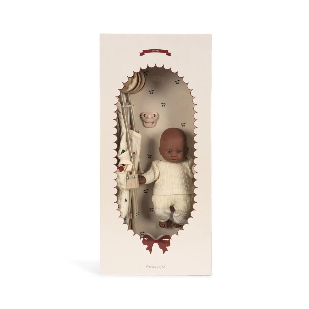 De Konges Slojd Cherie set is het perfecte cadeau voor de jongste liefhebbers van huisje spelen. Het bevat een klassieke poppenwagen in een tijdloos kersenpatroon en een schattige pop, die samen een set vormen waarmee direct uit de doos gespeeld kan worden.