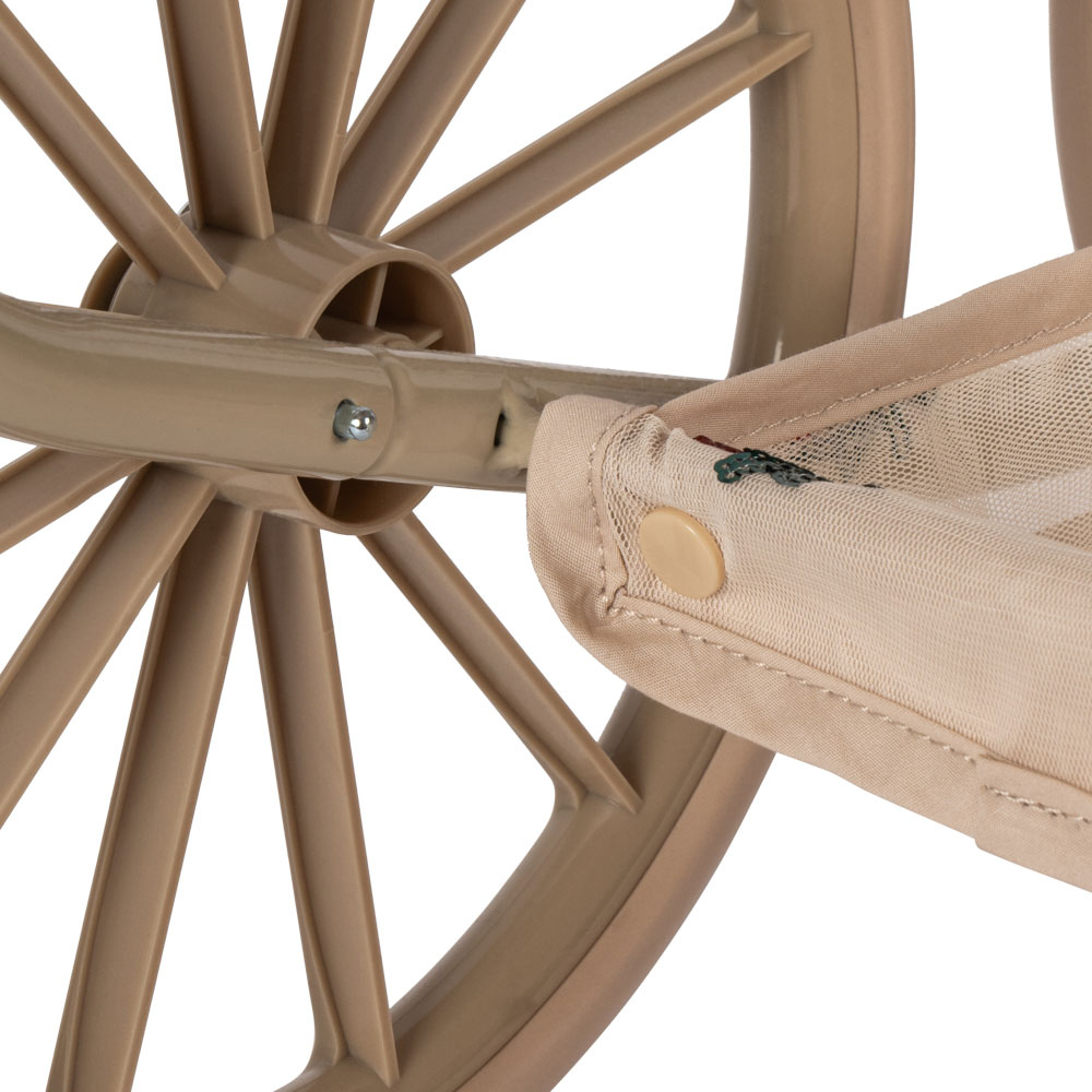 Deze poppenwagen heeft vier grote, stevige wielen, zacht afgewerkte handvatten en gewatteerde stof met een subtiele randafwerking, waardoor hij er heel elegant uitziet.
