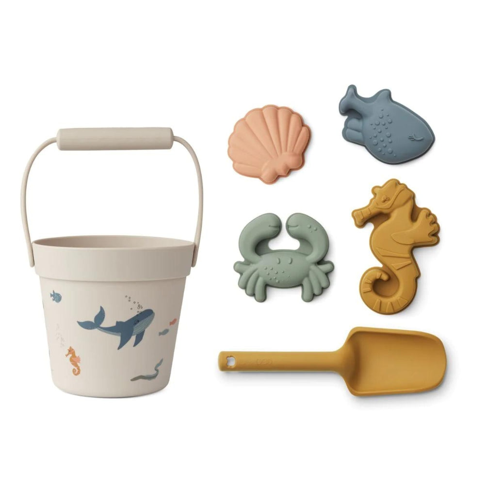 Uitzonderlijk 6-delig zandspeelgoed met zeedierenmotief van Liewood.