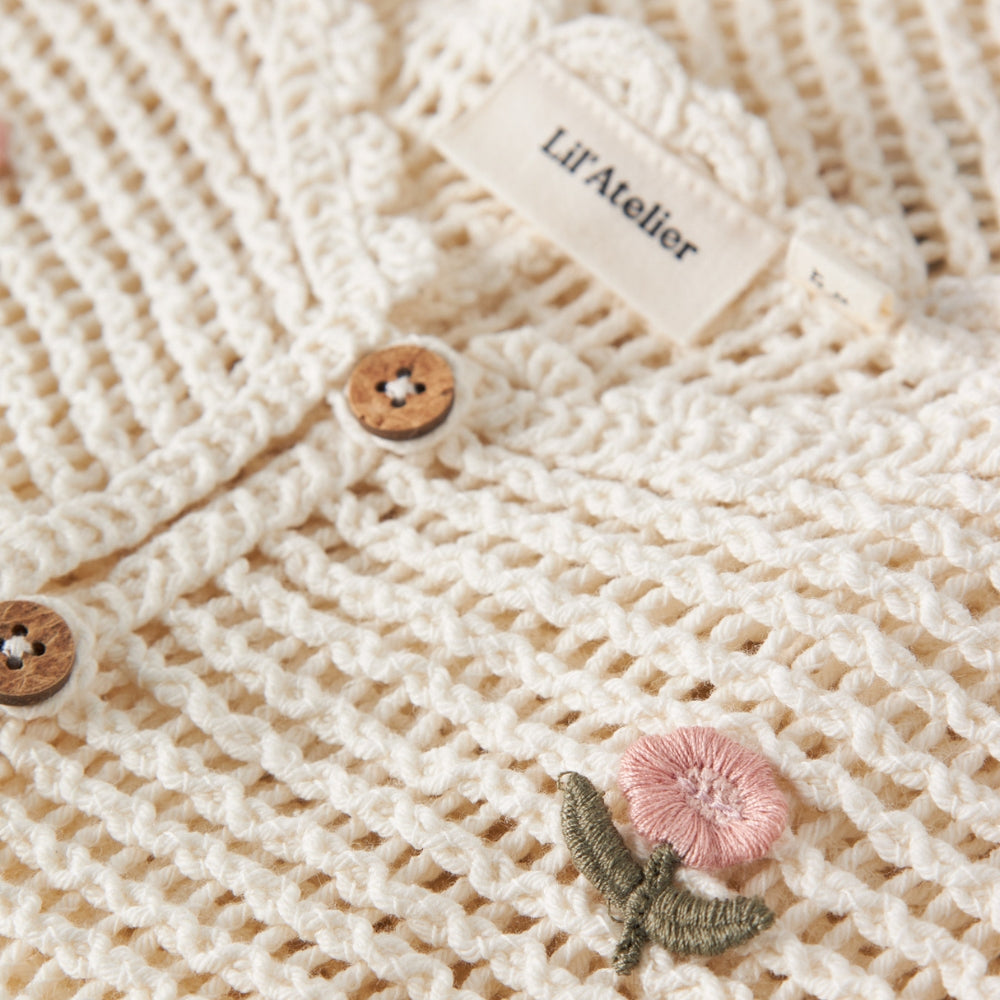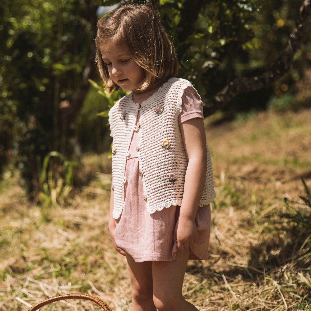 Met zijn delicate, meisjesachtige ontwerp, gebreide weving en lichte crèmekleur past het babyvestje zowel bij rompertjes als bij jurken of blouses met lange mouwen.