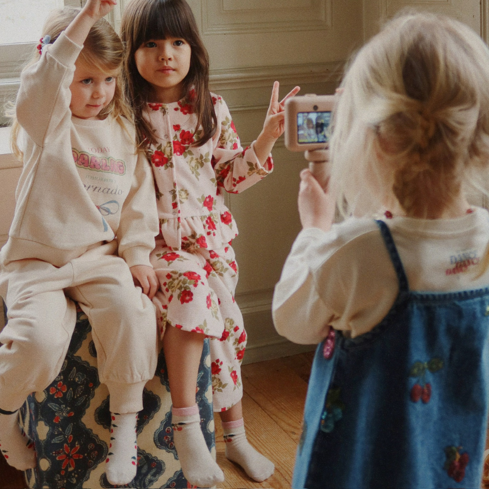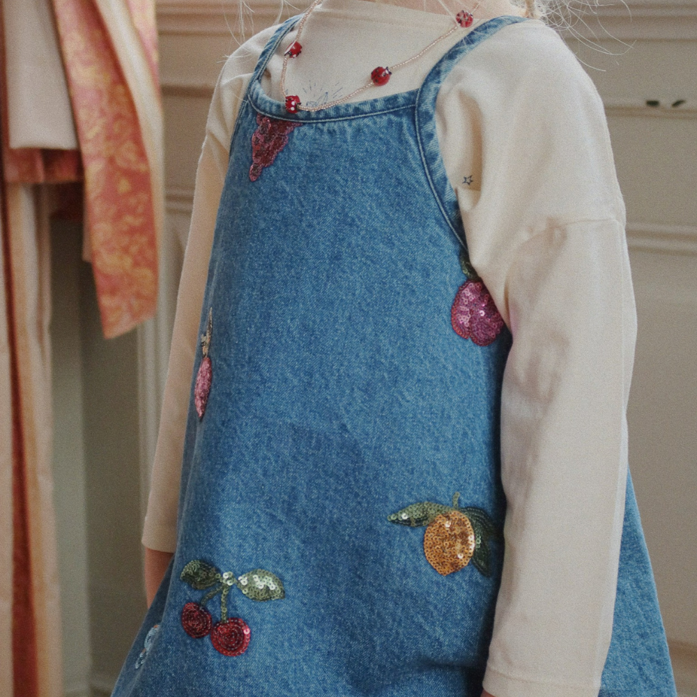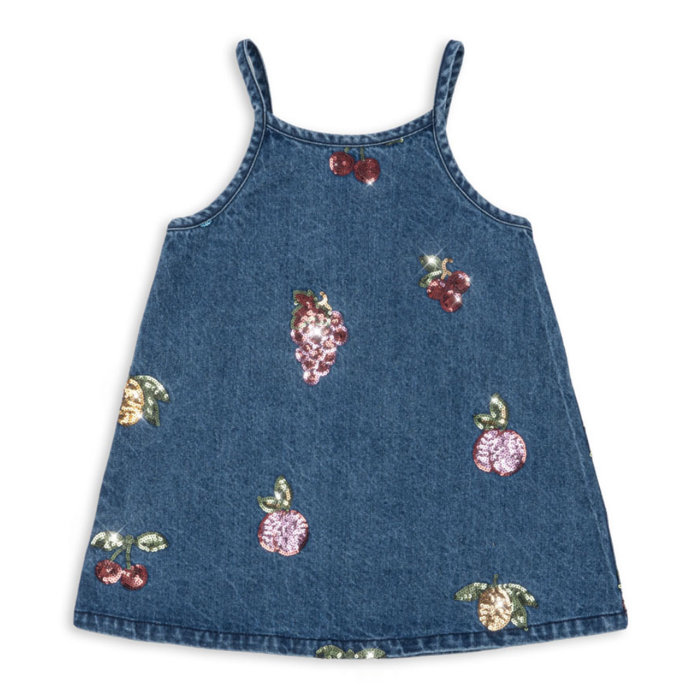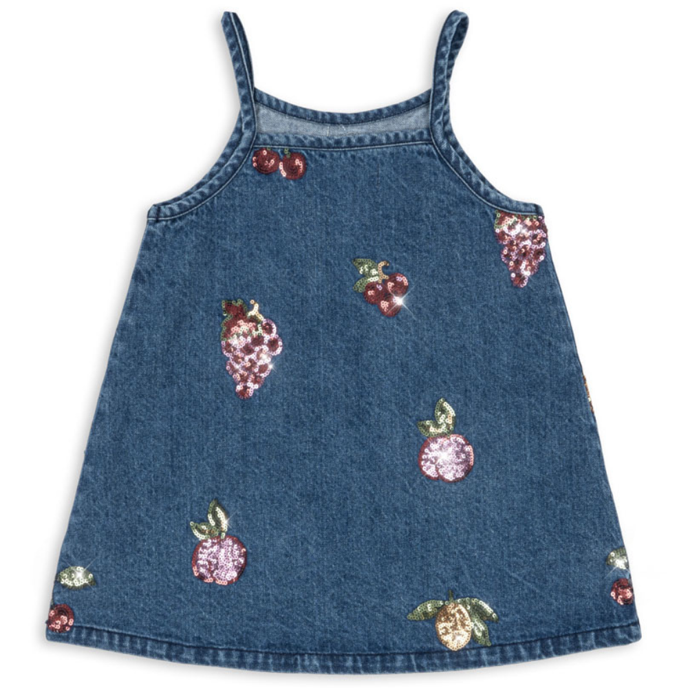 Deze denim kinderjurk van Konges Slojd maakt indruk met zijn subtiele glans - de geborduurde, met lovertjes versierde vruchten dragen bij aan zijn charme en geven elke outfit een zomerse, speelse uitstraling.