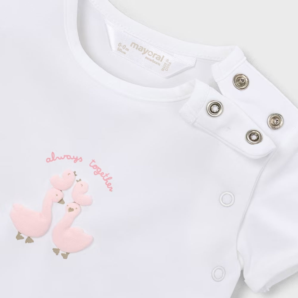 Door het schattige ganzenmotief ziet de newborn set er bijzonder zacht en kinderlijk uit.