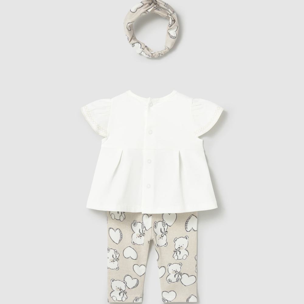 Deze set voor babymeisjes bestaat uit een T-shirt met korte mouwen, een comfortabele legging en een armband voor bewegingsvrijheid en comfort.
