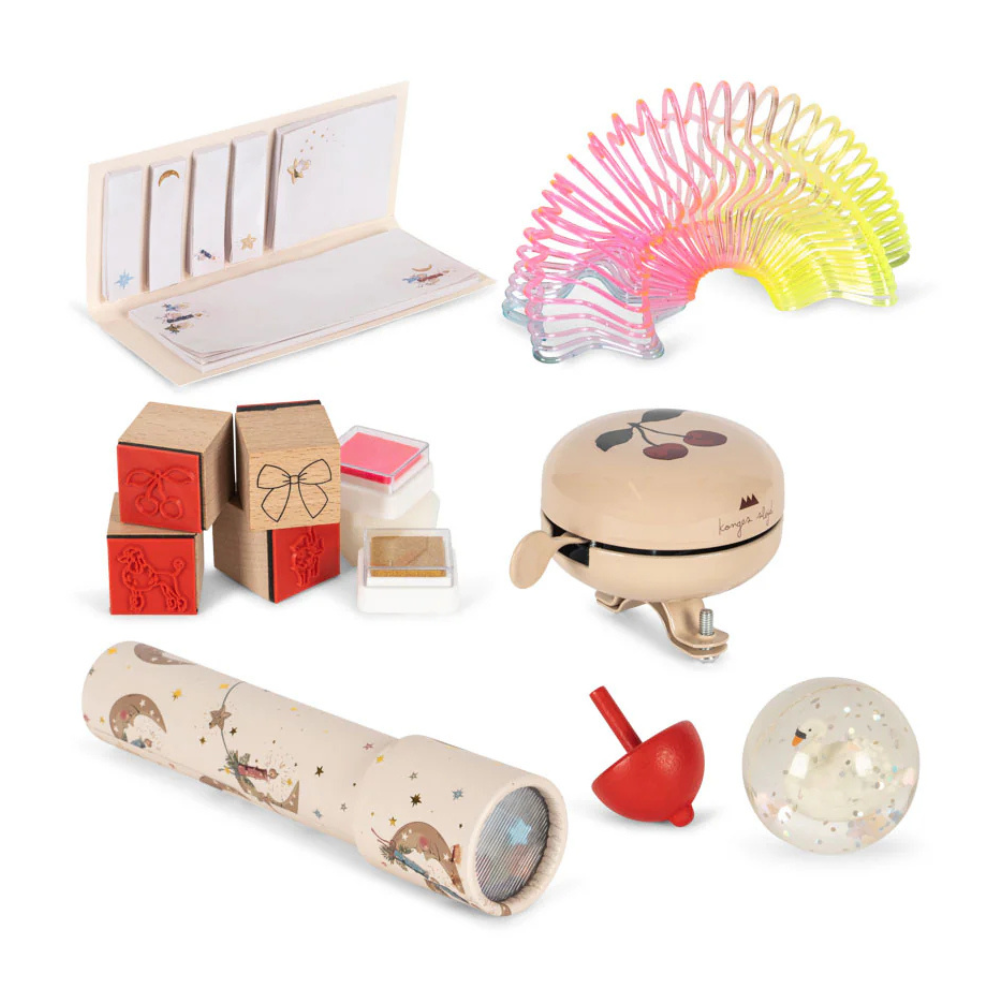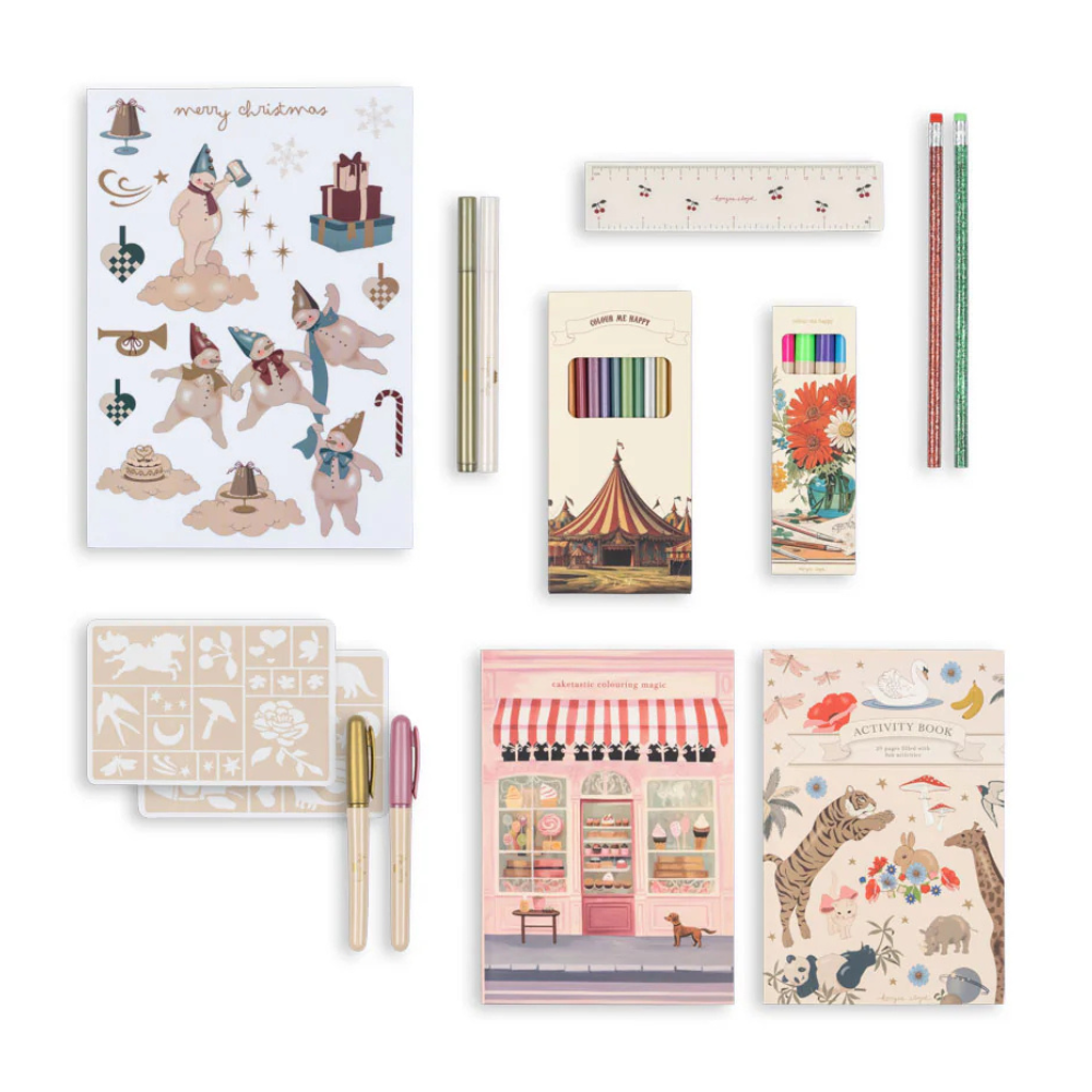 - De set bestaat uit: Kersttatoeages, een kleine teddybeer, een activiteitenboek (20 pagina's), 12 metallic kleurpotloden, een caleidoscoop, een magische veer, tatoeagepotloden met stencils, stickers, een spinner, het kaartspel "Zwarte Kat", stuiterbal, memoryspel (30 stuks), raamstickers (2 vellen), fietsbel, kleurboek A5 (20 pagina's), stempels, decoratie, decoratieve kiezels, 4 magische markers, notitieboekje, minipuzzels, raammarkers (2 st.), liniaal en glitterpotloden
