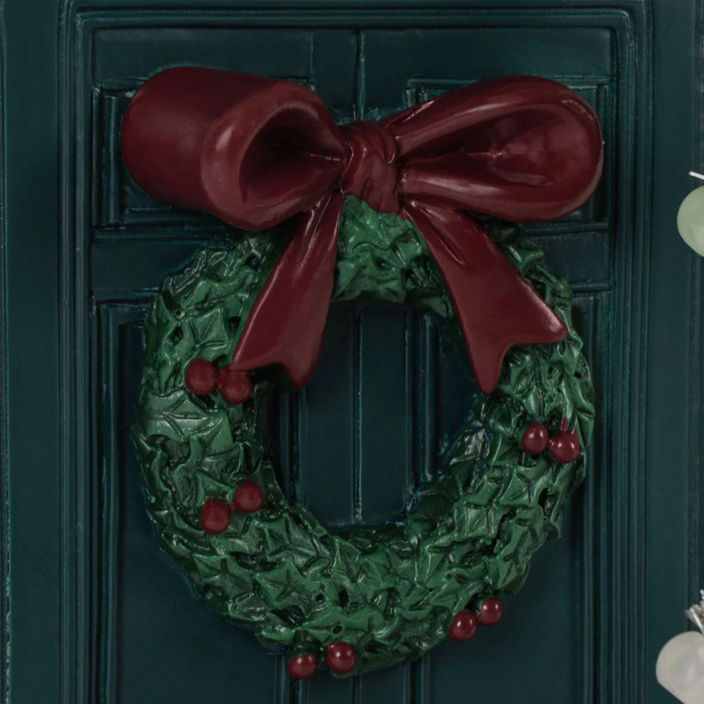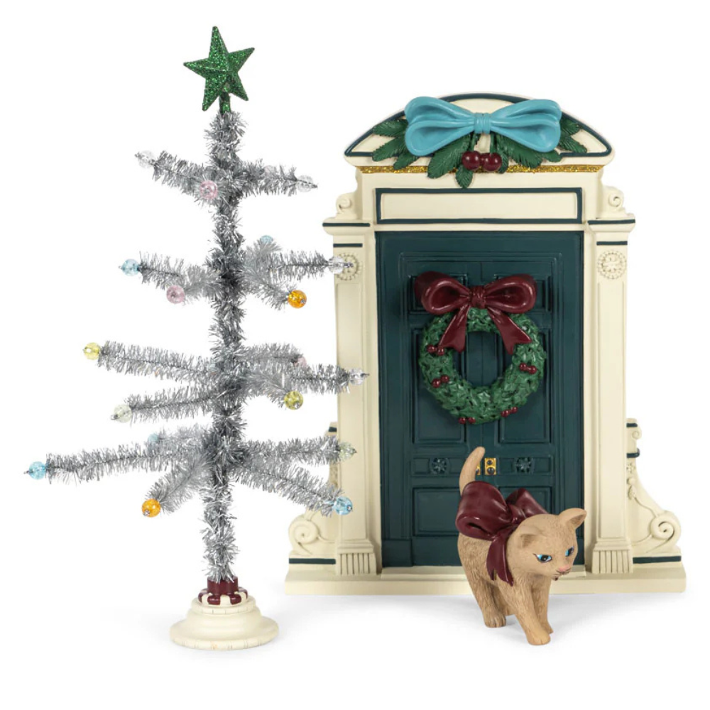 De set bevat een schattige deur, een poesje met een strik en een kerstboom, zodat je snel je eigen miniscène kunt maken.