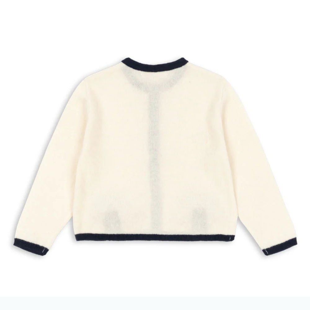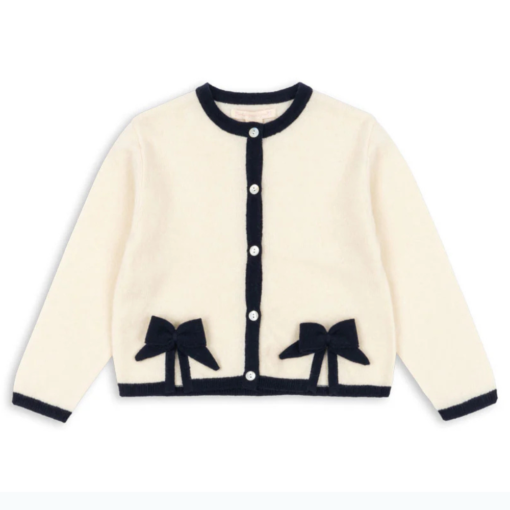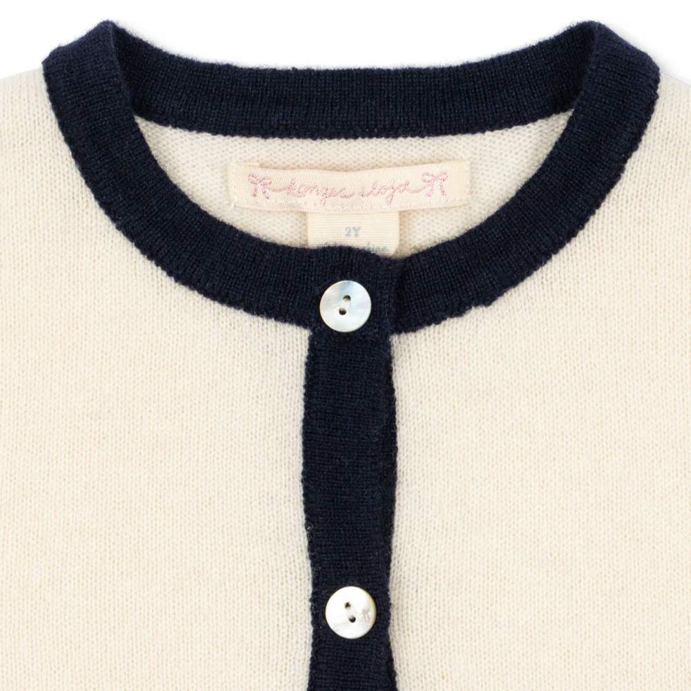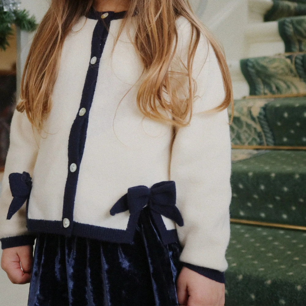 Deze kindertrui heeft een klassieke pasvorm met een ronde halslijn, contrasterende biezen en parelmoeren knopen, delicate strikjes voegen subtiele charme toe.