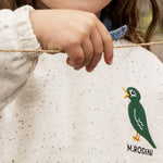 De geribde kraag accentueert de casual stijl van het sweatshirt, terwijl de delicate geborduurde vogelpatch op de borst een subtiel maar opvallend detail is, in lijn met de esthetiek van het merk Mini Rodini.