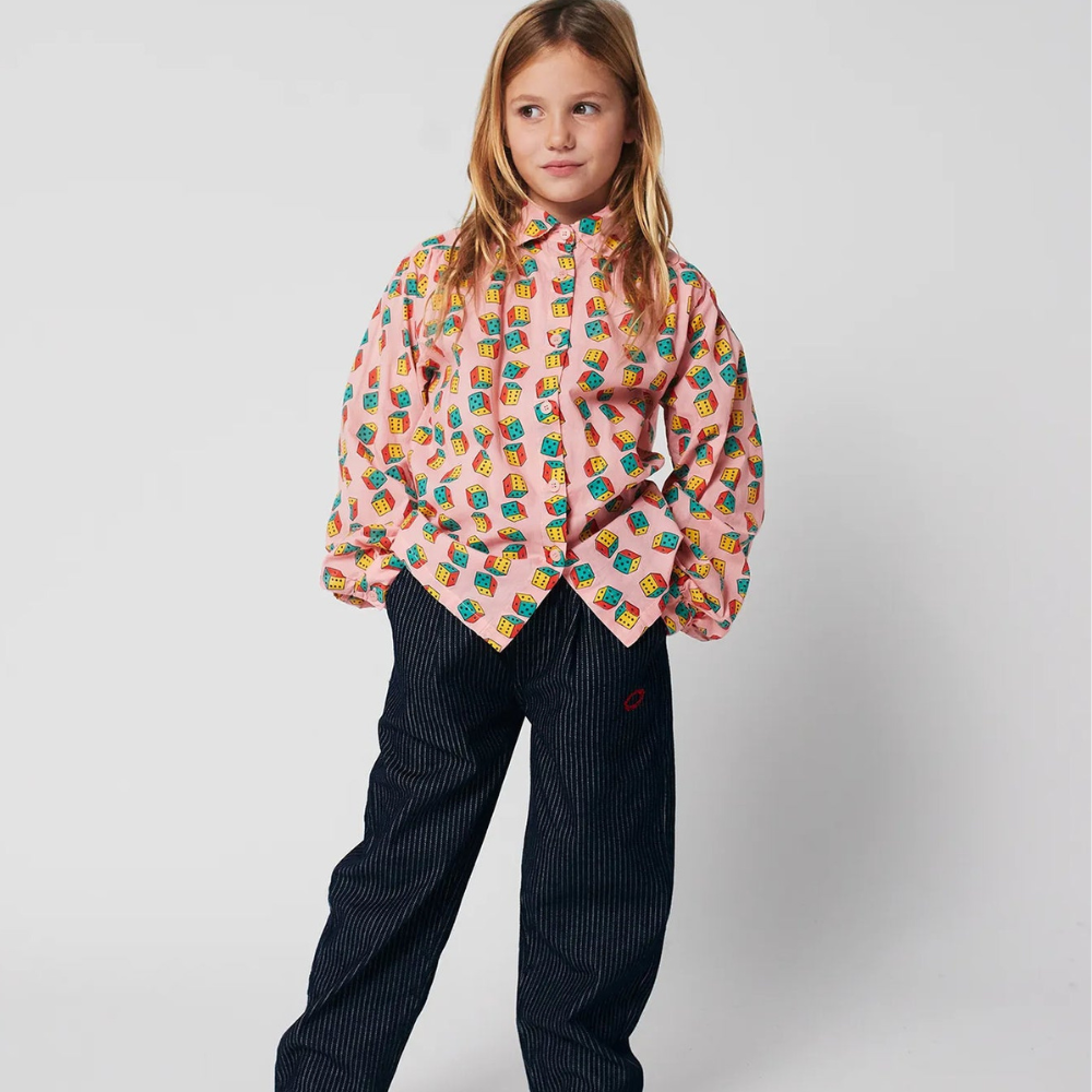 De vrolijke print met een motief van kleurrijke dobbelstenen op een roze achtergrond verwijst naar de wereld van spel, creativiteit en kinderfantasie - zo typerend voor de Bobo Choses-collectie.