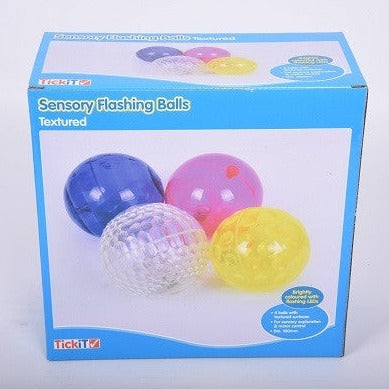 Sensorische ballen met textuur van het merk TickiT lichten op en knipperen als ze stuiteren.