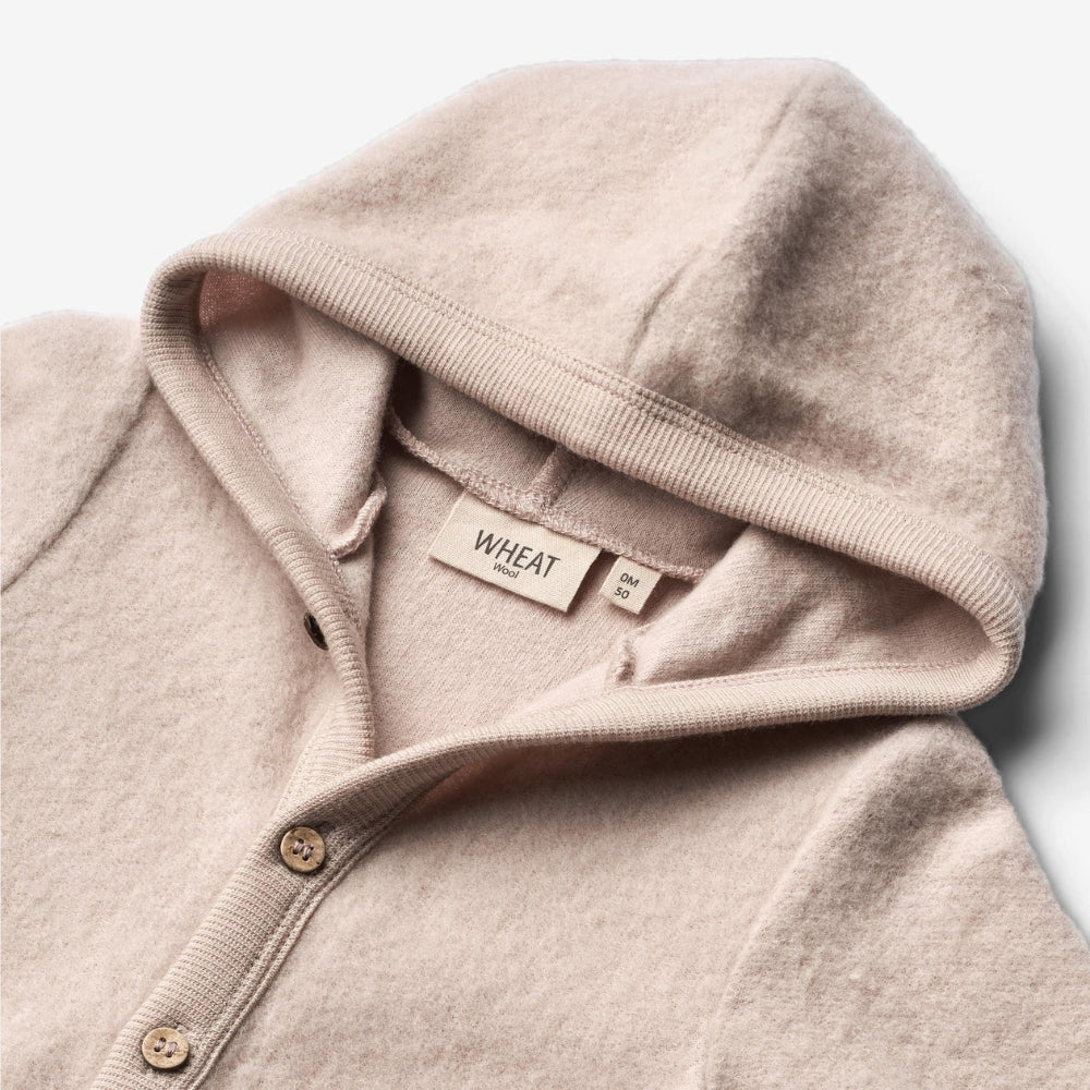 De Wheat merinowollen baby jumpsuit is de perfecte keuze voor koudere dagen. Met een zachte mix van vervilte merinowol en biologisch katoen is het kledingstuk aangenaam om aan te raken en houdt het baby warm en comfortabel.