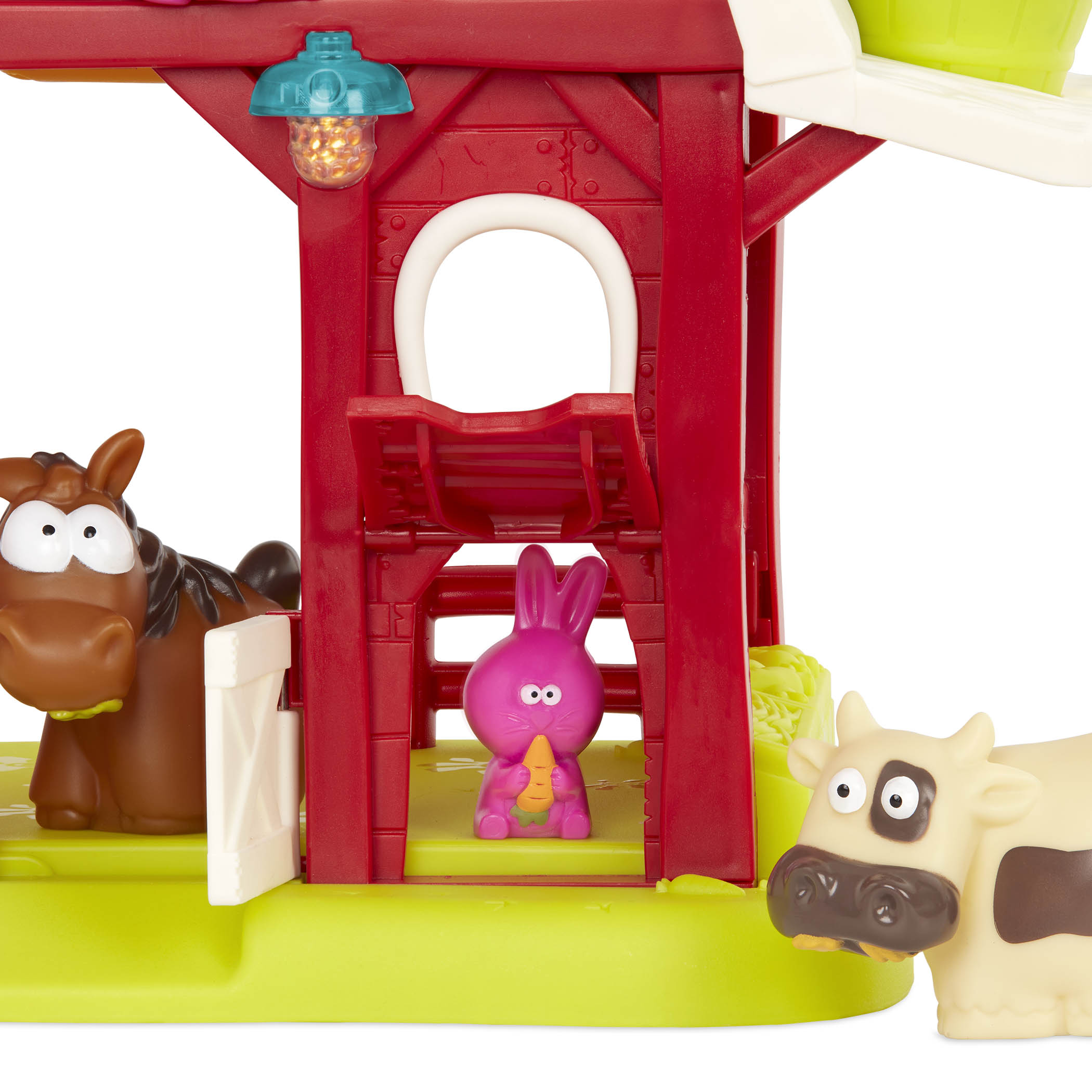 Het interactieve speelgoed van B.Toys heeft een licht- en geluidsfunctie, open gewoon de deur van de boerderij om de geluiden van boerderijdieren en een vrolijk liedje te horen.