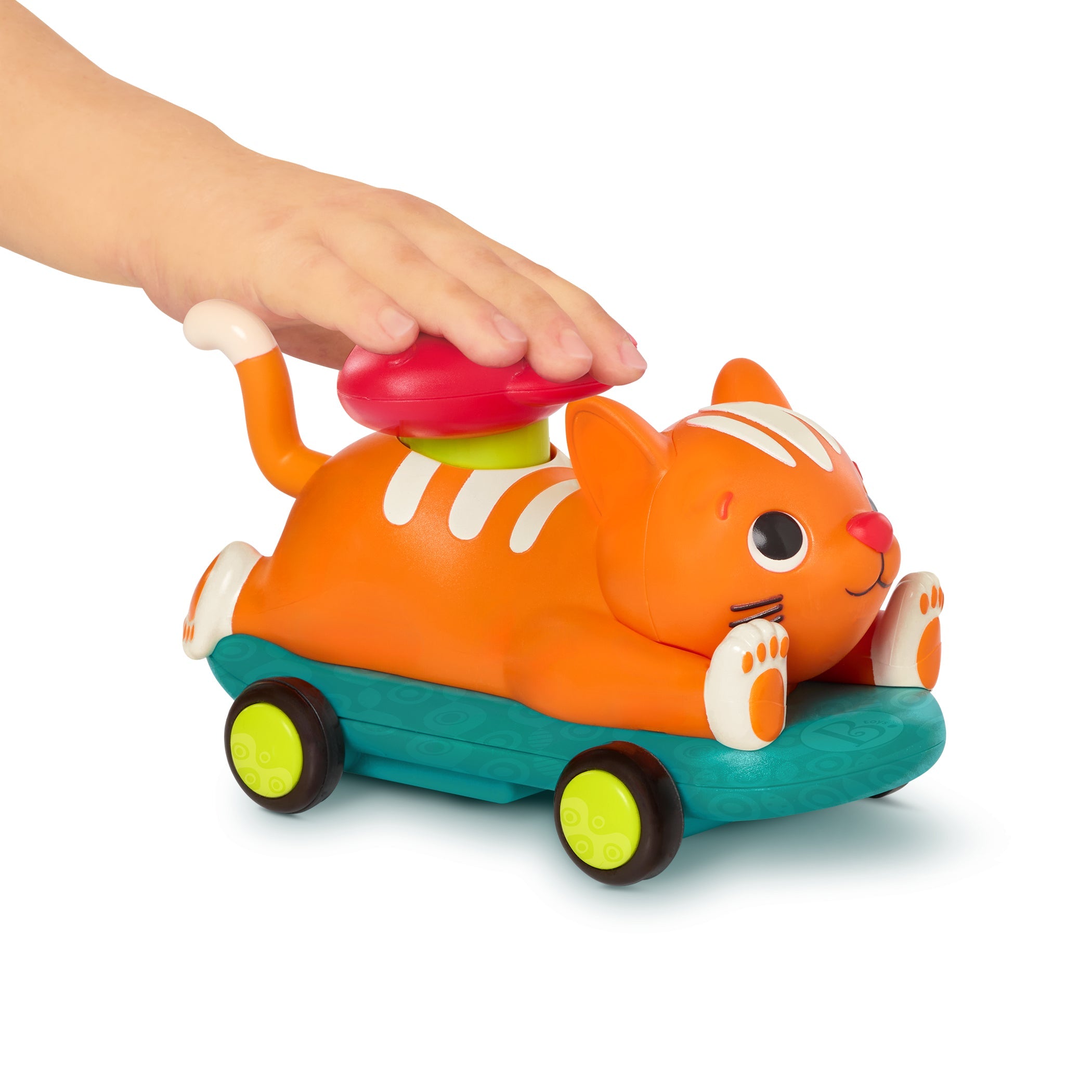 De B.Toys PawMobiles Push&,Go auto's zijn een duo vol energie: druk het voertuig van bovenaf in en de hond en kitten zetten kwispelend de achtervolging in.