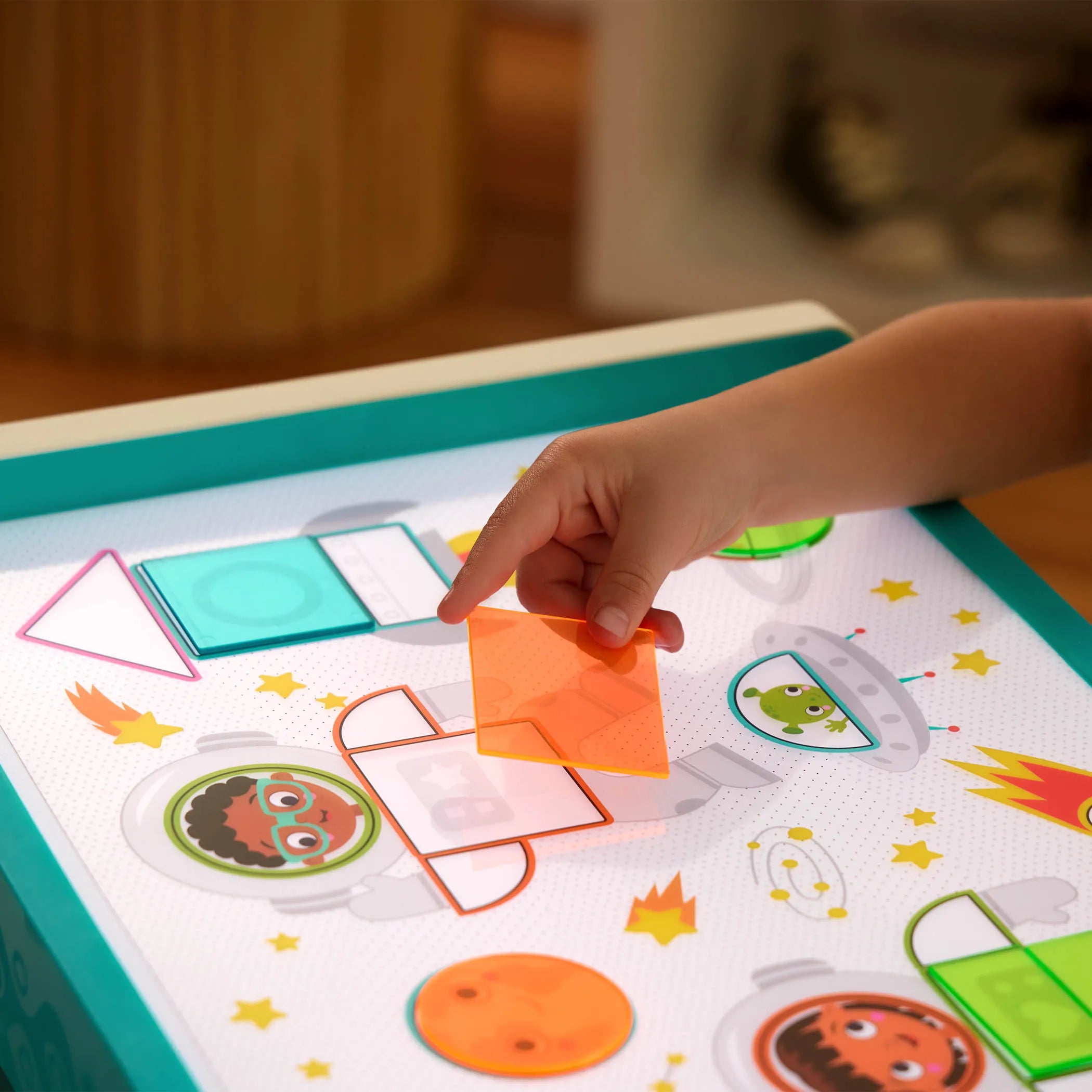 Met vijf kleuren achtergrondverlichting en twee helderheidsniveaus komt elke tekening tot leven, terwijl je met 50 transparante vormen, 10 3D-cijfers en sjablonen kunt experimenteren met kleurlagen, compositie en voor het eerst tellen.