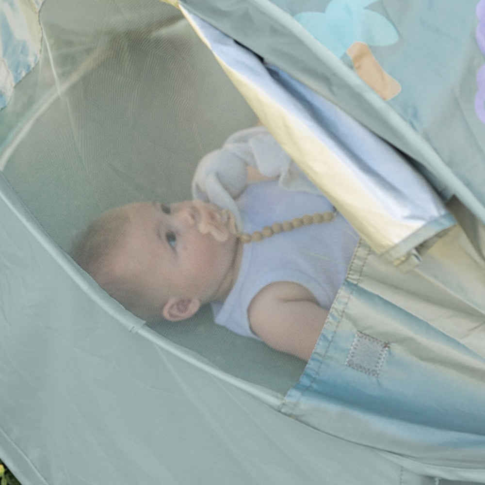 De pop-up tent kan met één hand worden opgezet om een gezellige en comfortabele plek te creëren om te spelen of te slapen en past in opgevouwen toestand in een lichtgewicht tas met schouderbanden, waardoor het een bijzonder mobiele oplossing is voor actieve ouders.