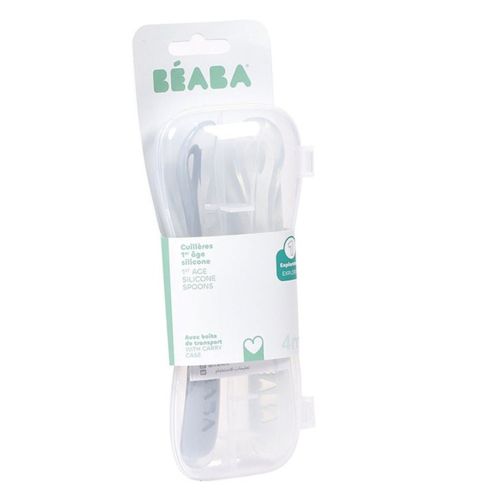 Beaba Set van 2 siliconen lepels in reisetui Pebble / Cloud blauw