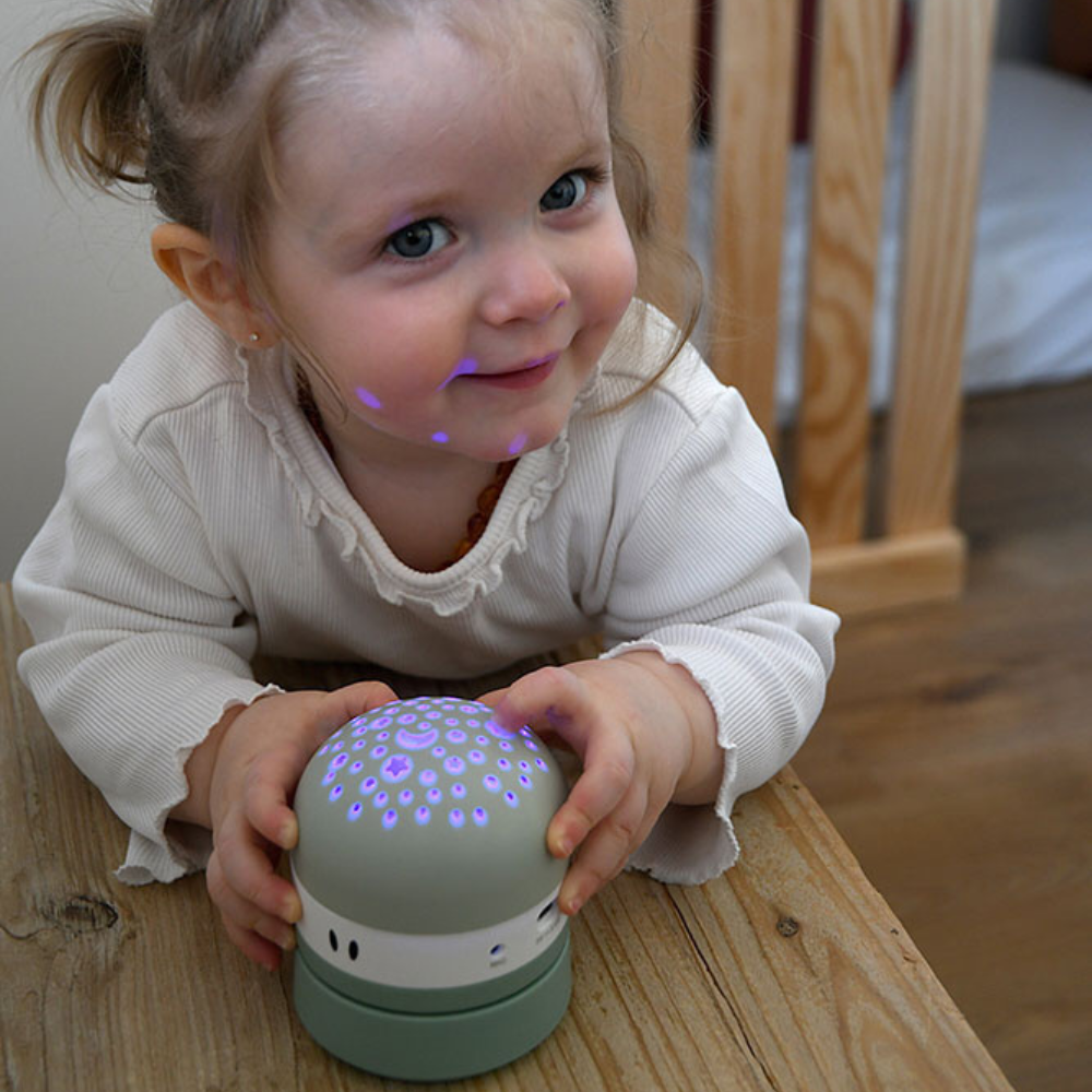Deze compacte projector helpt je kleintje te kalmeren voor het slapengaan door hem te omhullen met een zachte sterrenhemel en rustgevende geluiden.