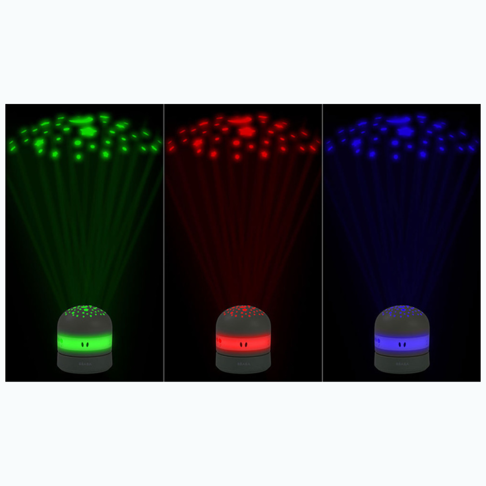 Het Beaba apparaat projecteert sterren in drie kleuren - rood, groen, blauw - met een keuze uit constant, wisselend of willekeurig licht. Met de verstelbare projectiehoek kun je het beeld op het plafond, de muur of een locatie naar keuze richten - precies waar je baby graag kijkt voor het slapengaan.