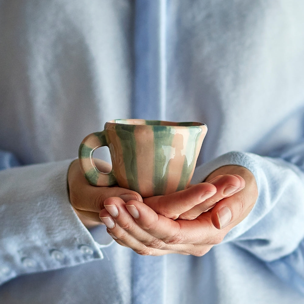 Het oppervlak van de mok is met de hand versierd met verticale strepen in een gedempte groene tint, waardoor het een unieke, ambachtelijke uitstraling heeft.