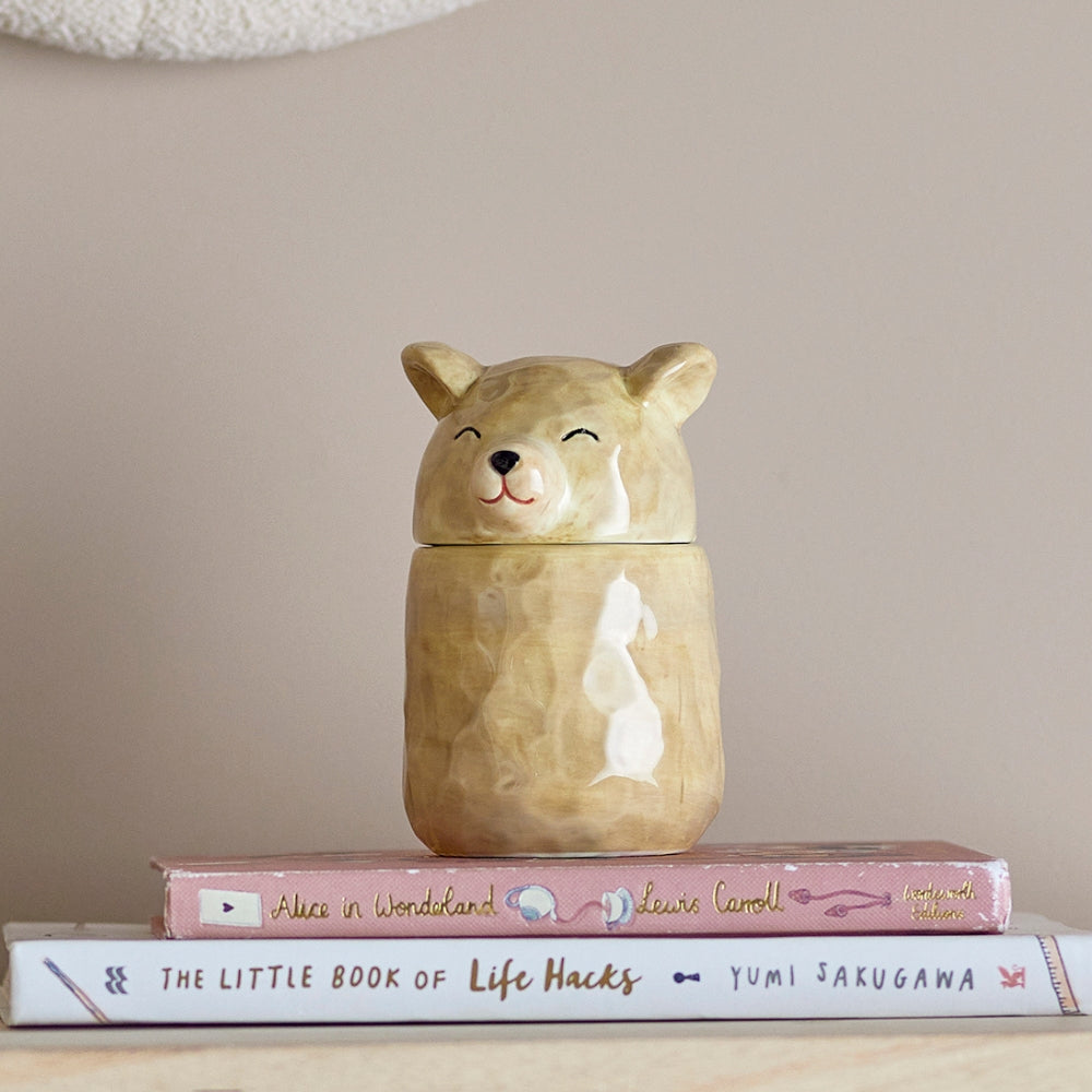 De Bloomingville MINI Puk Jar met deksel in grijs is een prachtig accessoire dat de kinderkamer zal opvrolijken en zal helpen om kleine spulletjes te organiseren.