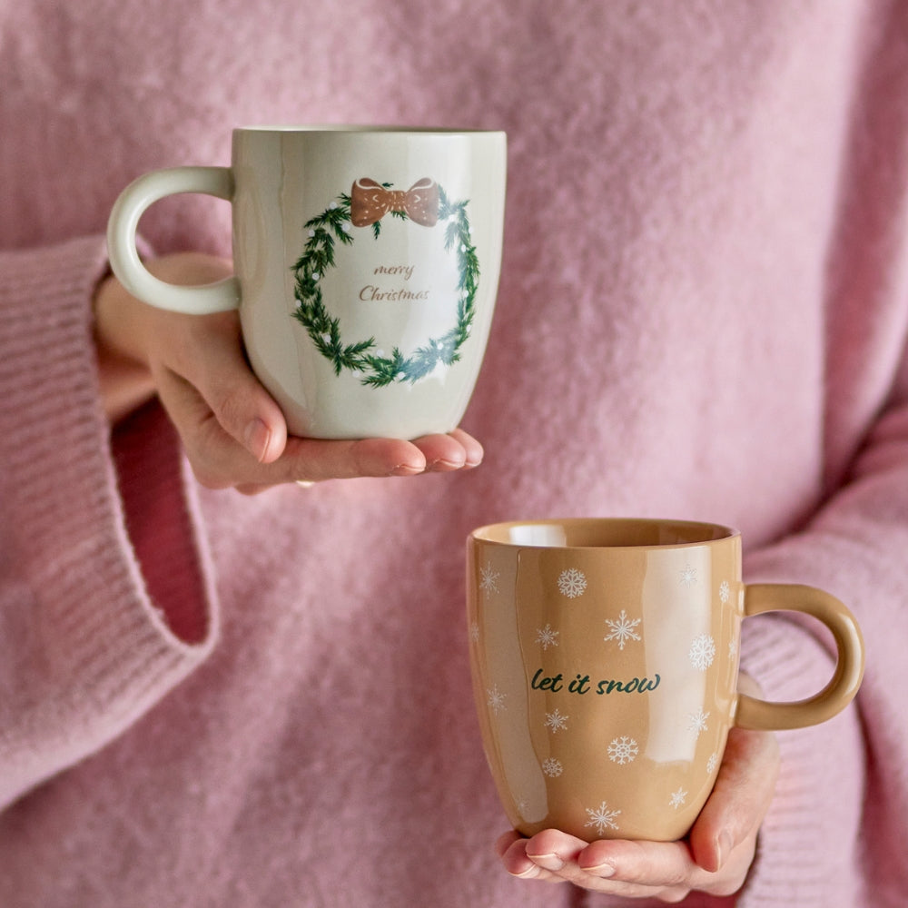 De set bestaat uit twee steengoed koffiemokken, versierd met schattige motieven - de ene heeft de woorden 'Let it snow' omringd door sneeuwvlokken, en de andere een klassieke slinger met de woorden 'Merry Christmas'.