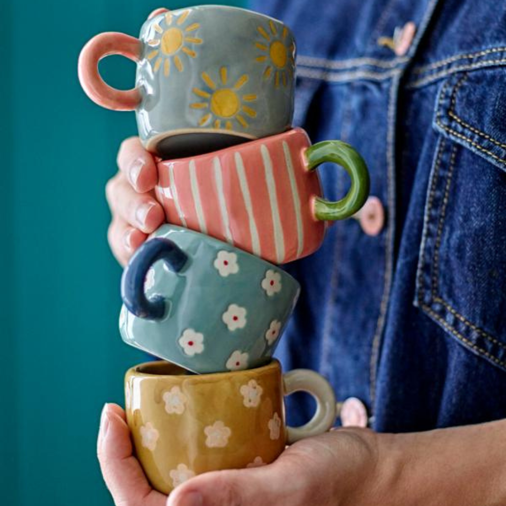 De Nini set zijn mokken van Bloomingville die direct een vrolijk tintje aan de tafel geven en zelfs een eenvoudige thee er 'feestelijker' uit laten zien. Elk stuk heeft een handgeschilderd ontwerp in verschillende kleuren, waardoor de mokken er licht, speels en heel 'huiselijk' uitzien - perfect voor familieontbijtjes of afternoon tea.
