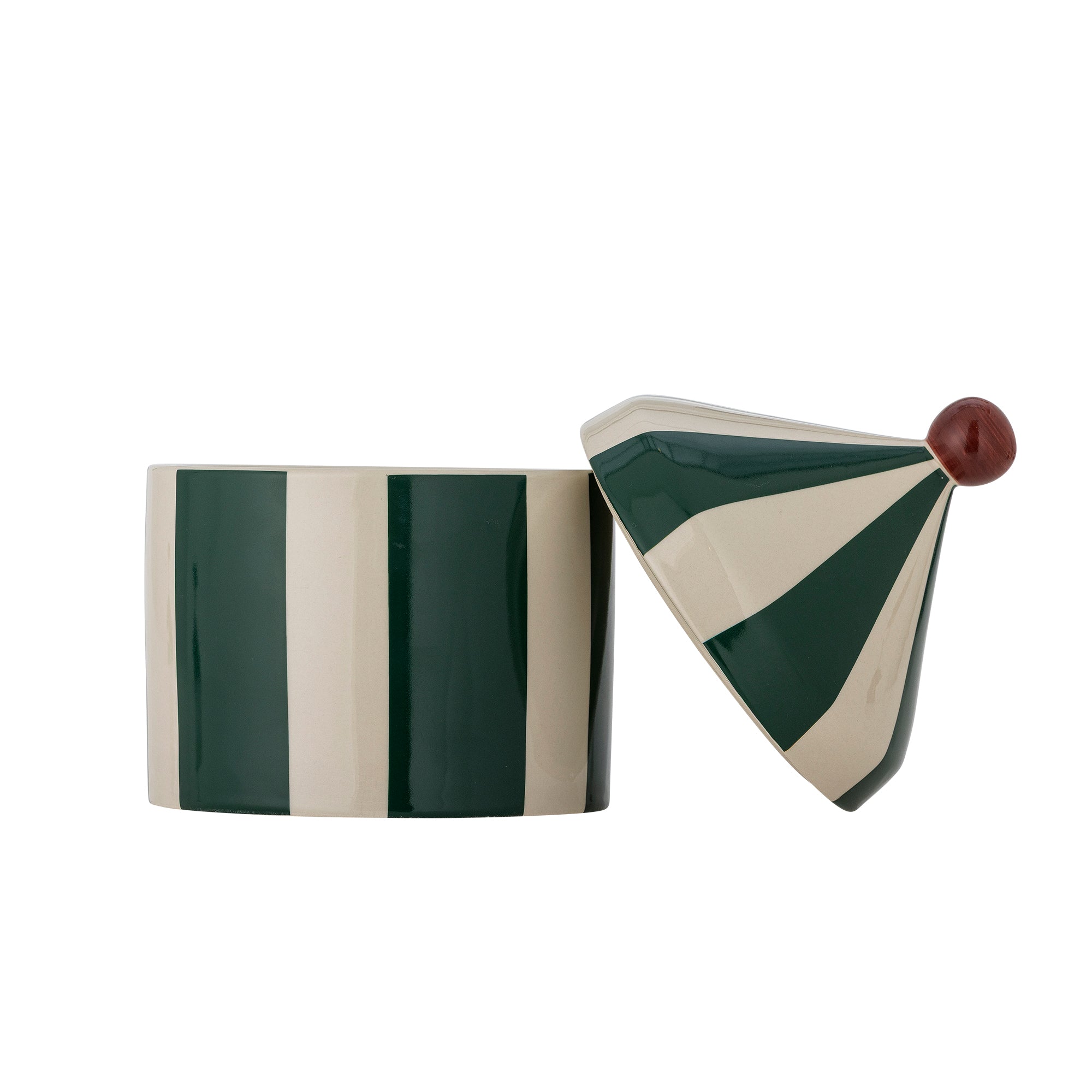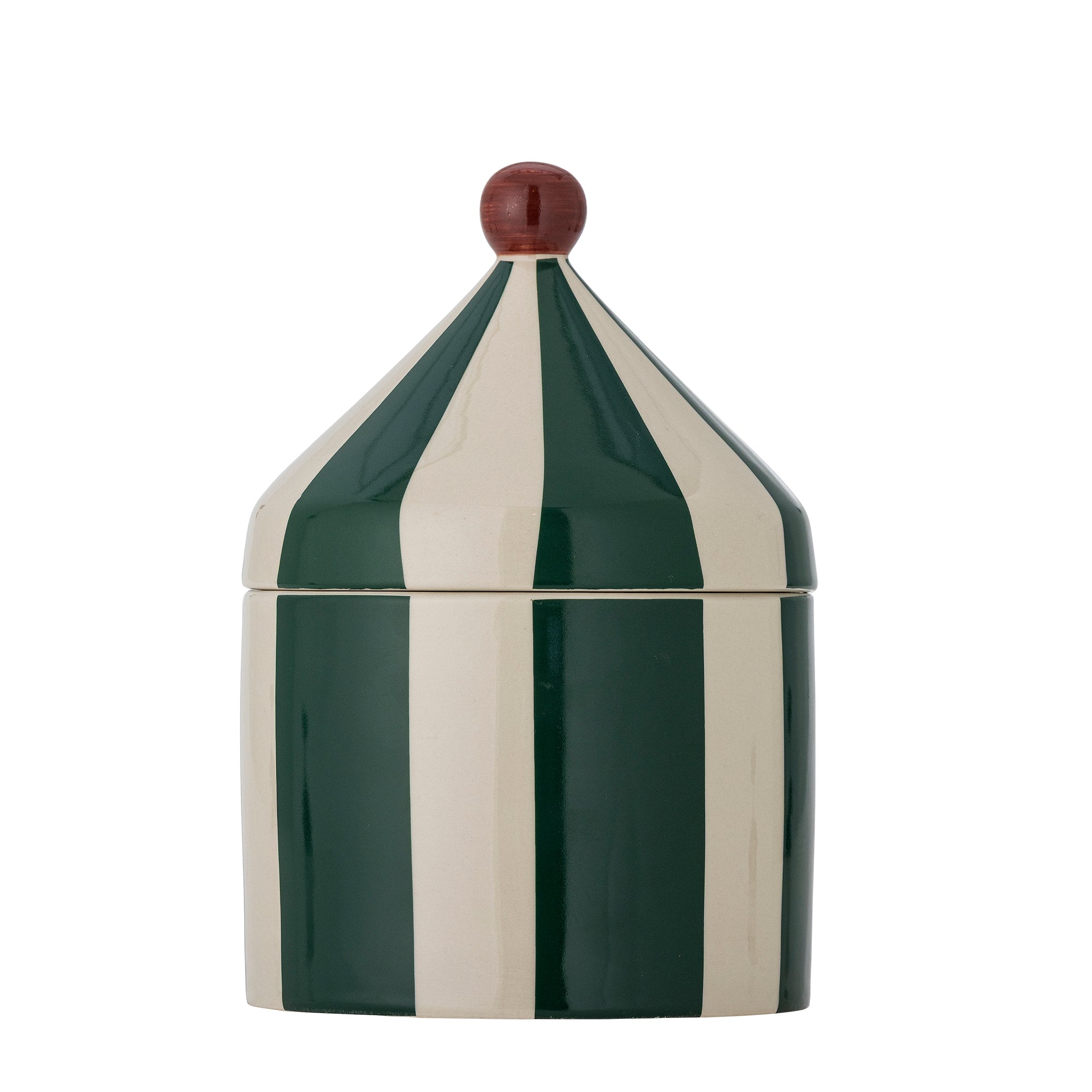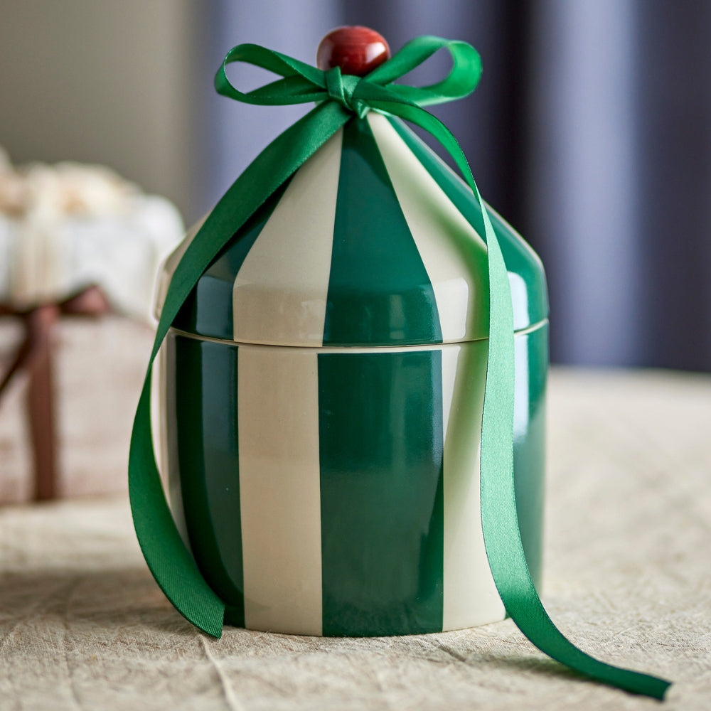 De opbergdoos heeft de schattige vorm van een circustent en is gemaakt van steengoed met blauwe en witte strepen.