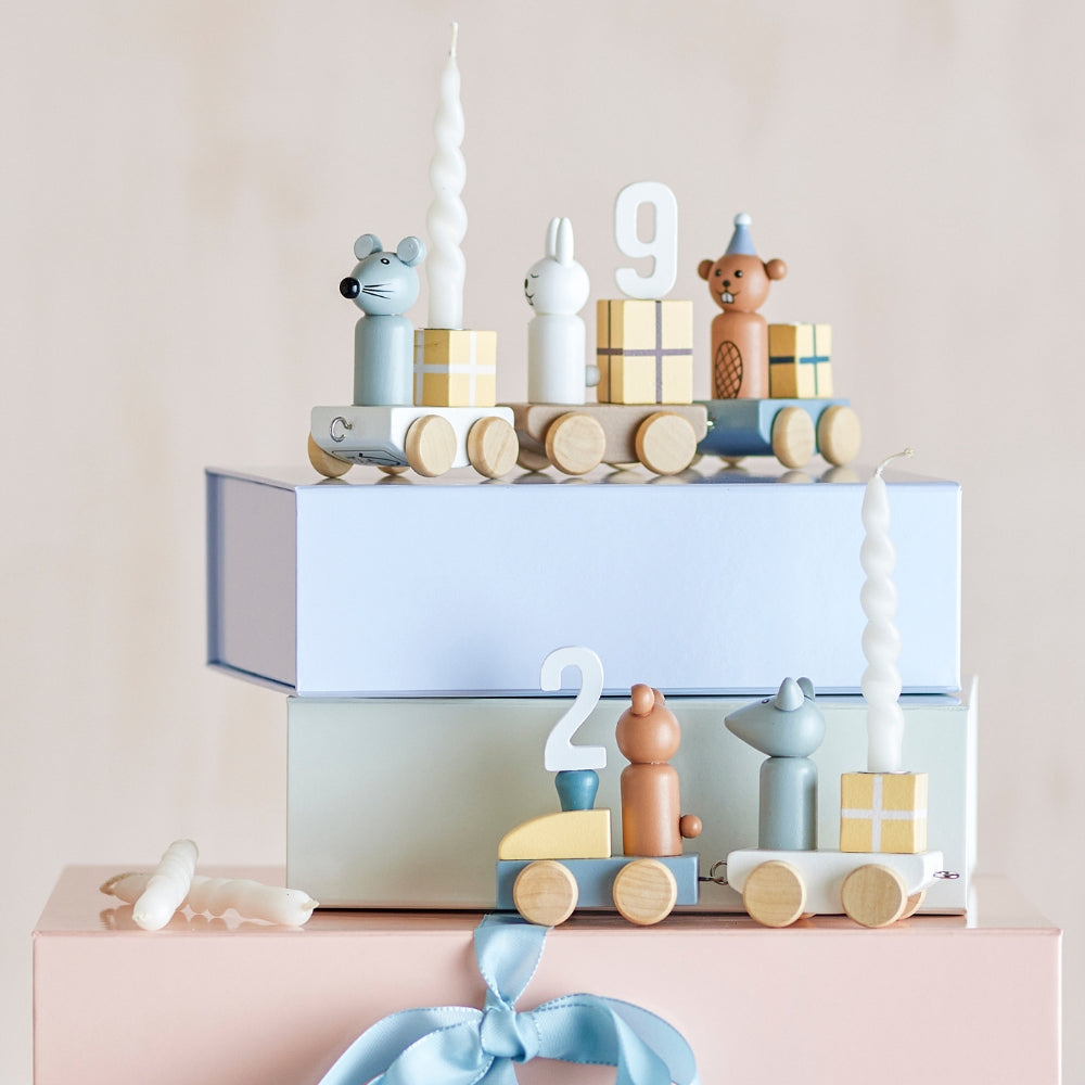 - Inhoud set: verjaardagstrein met 5 wagons, nummers 0-9, element met ruimte voor 3 kaarsen