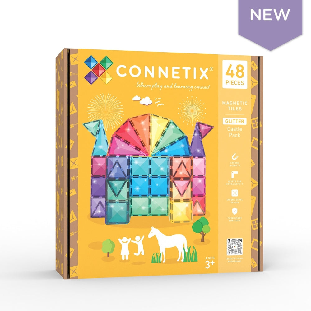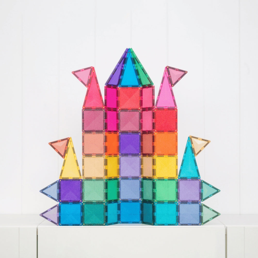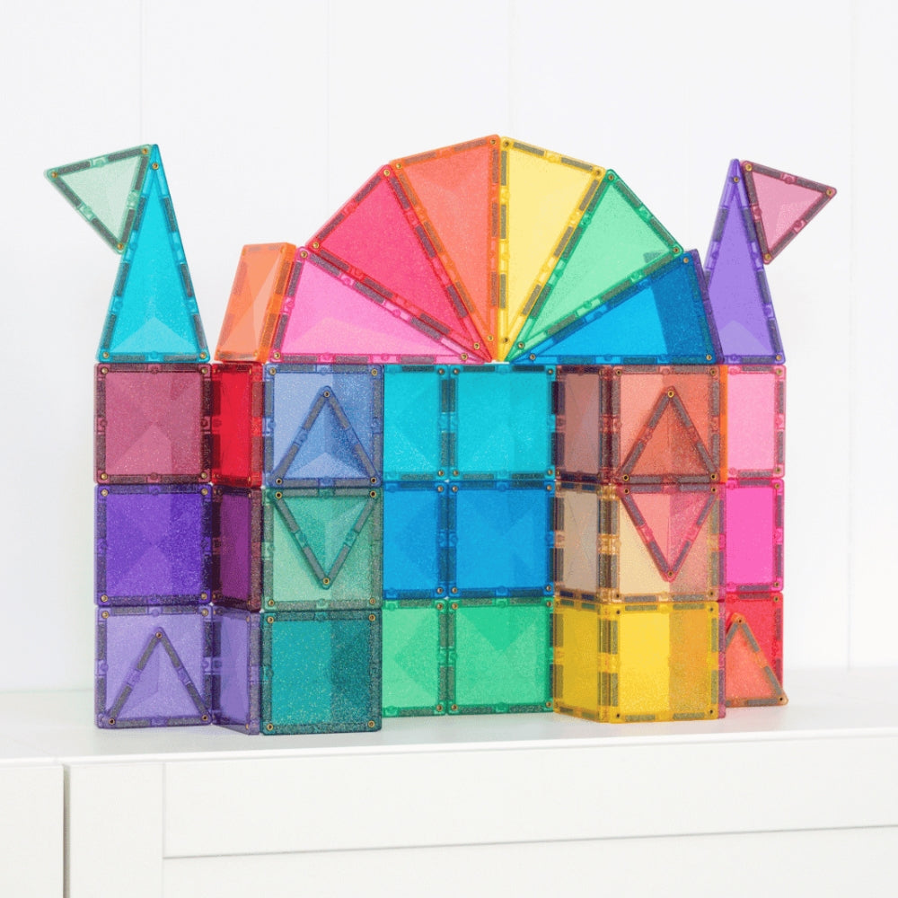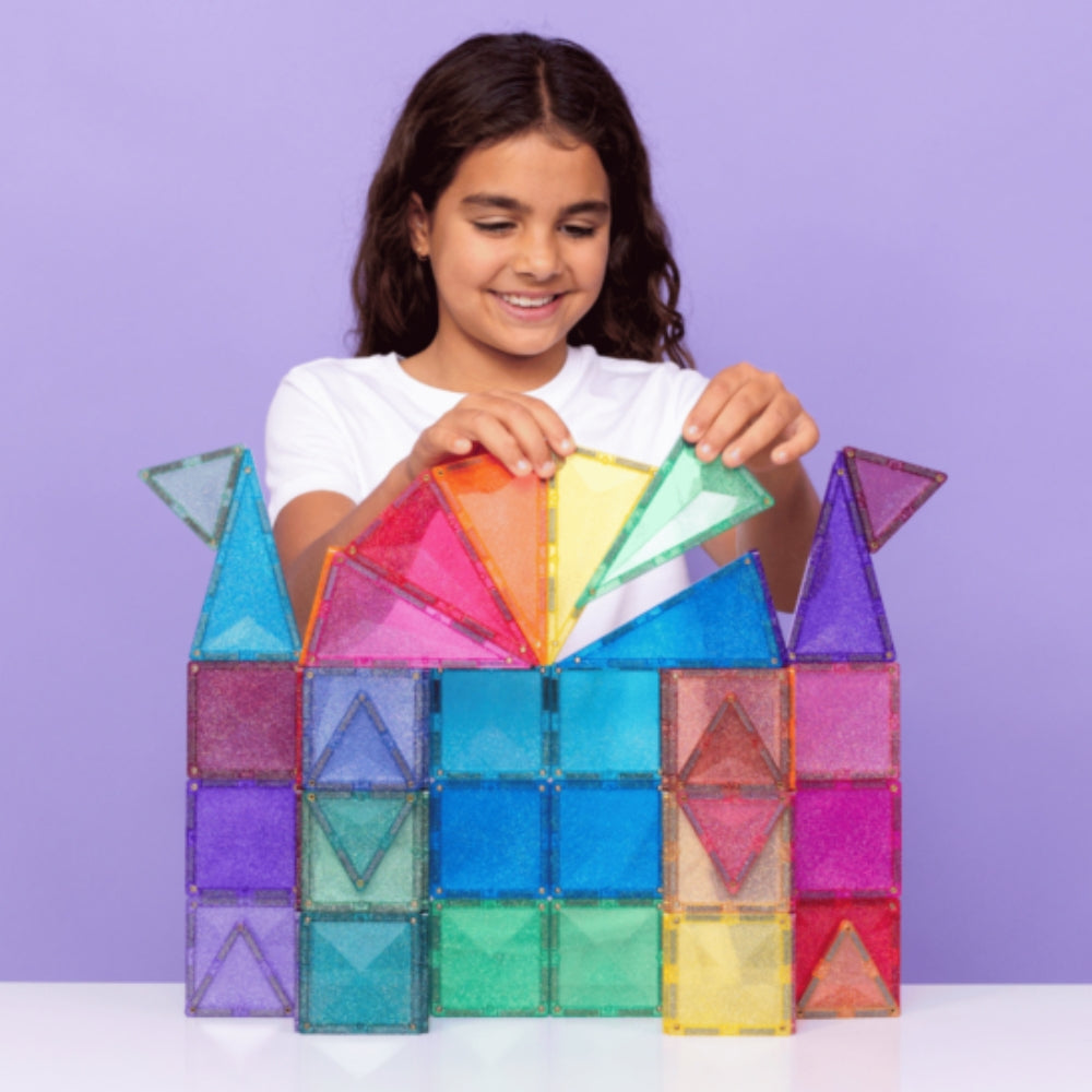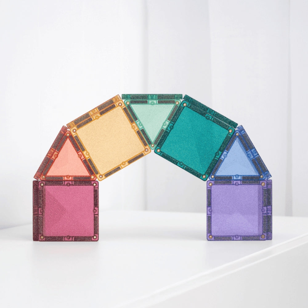 Ontwikkeld met kleine ontdekkingsreizigers en sprookjesreizigers in gedachten, voegen de glittertegels in pastel- en regenboogkleuren een vleugje magie toe aan elk gebouw. De magnetische blokken met vierkanten en driehoeken (gelijkzijdig en gelijkbenig) schitteren met veelkleurige glitters, waardoor het voor kinderen leuk wordt om glimmende kastelen, bruggen, torens, dieren en alles wat hun fantasie maar kan bedenken te maken.