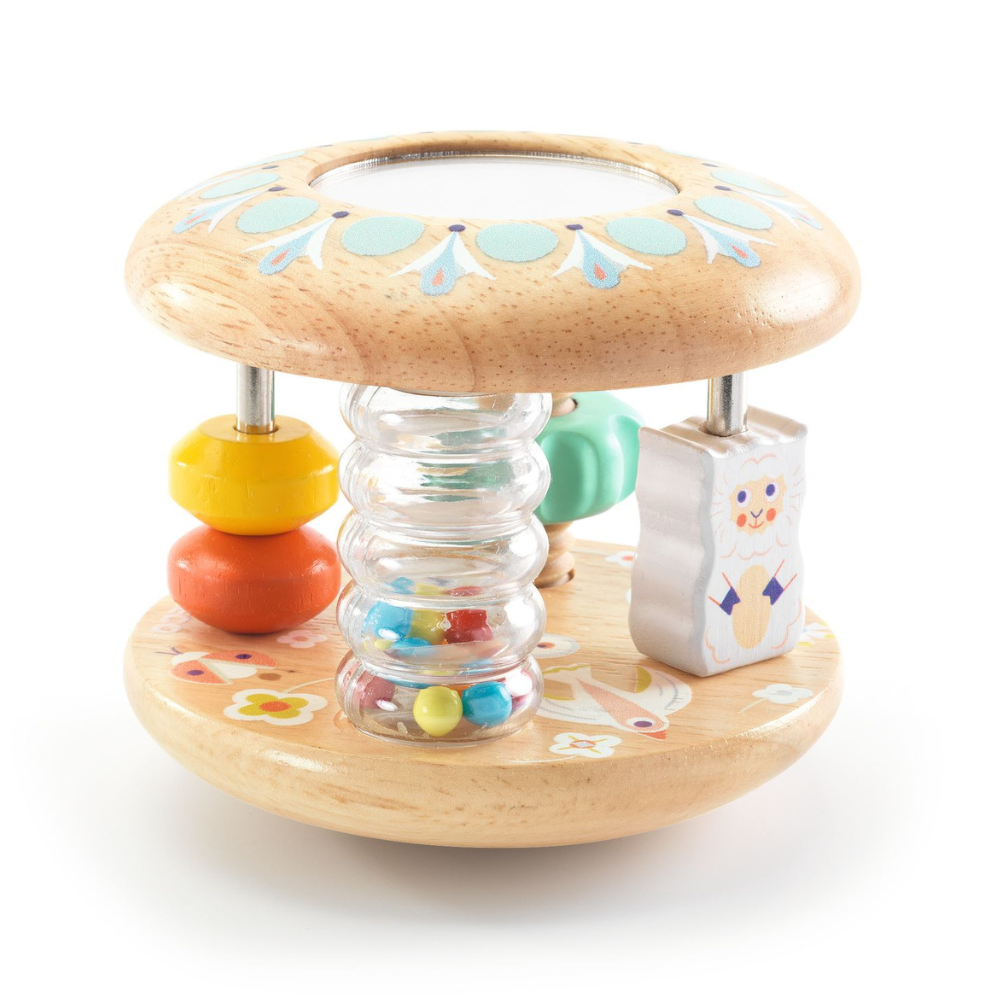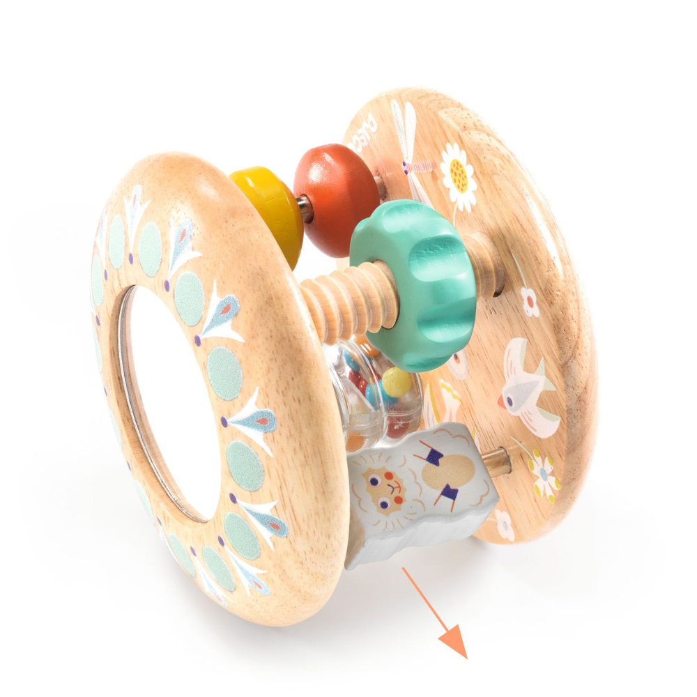 Dit compacte speeltje in zachte pasteltinten is gemaakt van natuurlijk hout en nodigt je kleintje uit om zes activiteiten te ontdekken: het schaapje draaien, de kralen bewegen, het op zijn kant leggen, de kralen zien vallen, de bloem vastschroeven en in het spiegeltje kijken.