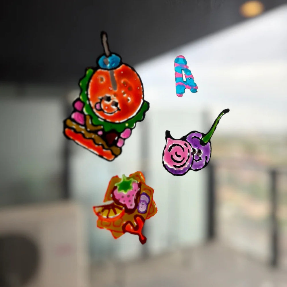 Omlijn gewoon een vorm, vul hem met kleur, wacht tot hij droog is en trek hem eraf om een glanzende decoratie te maken die je op een raam, spiegel, glas of andere gladde oppervlakken kunt plakken.