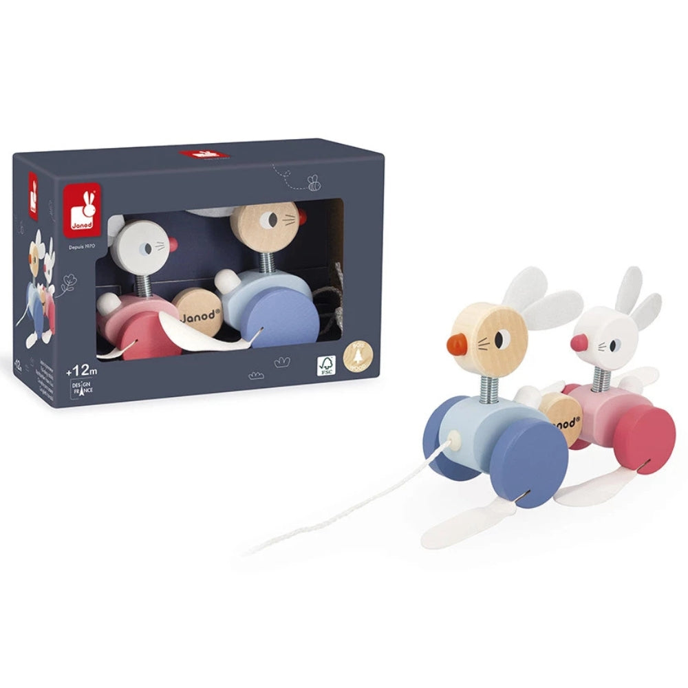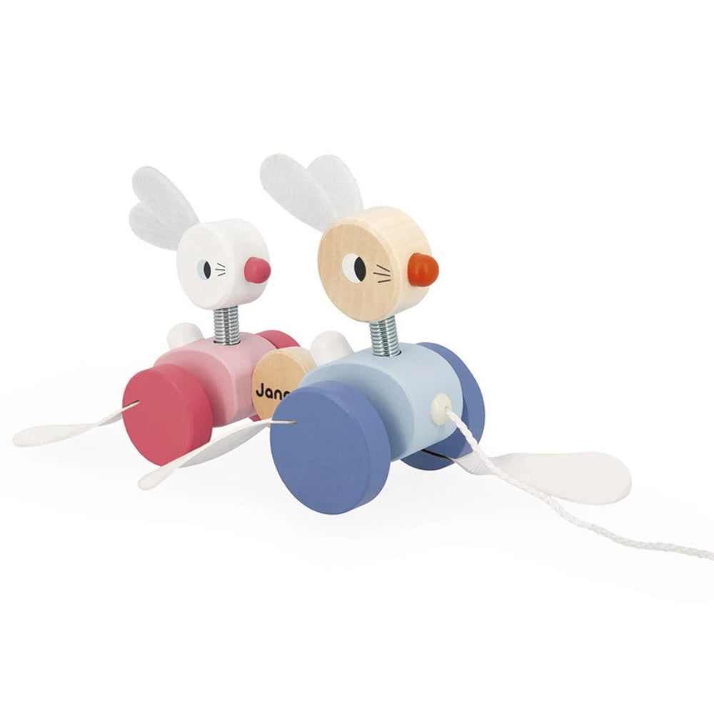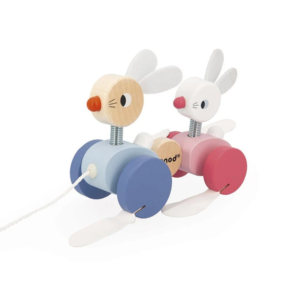 Het Janod trekspeelgoed is een schattige familie konijntjes die een peuter overal mee naartoe kan nemen.