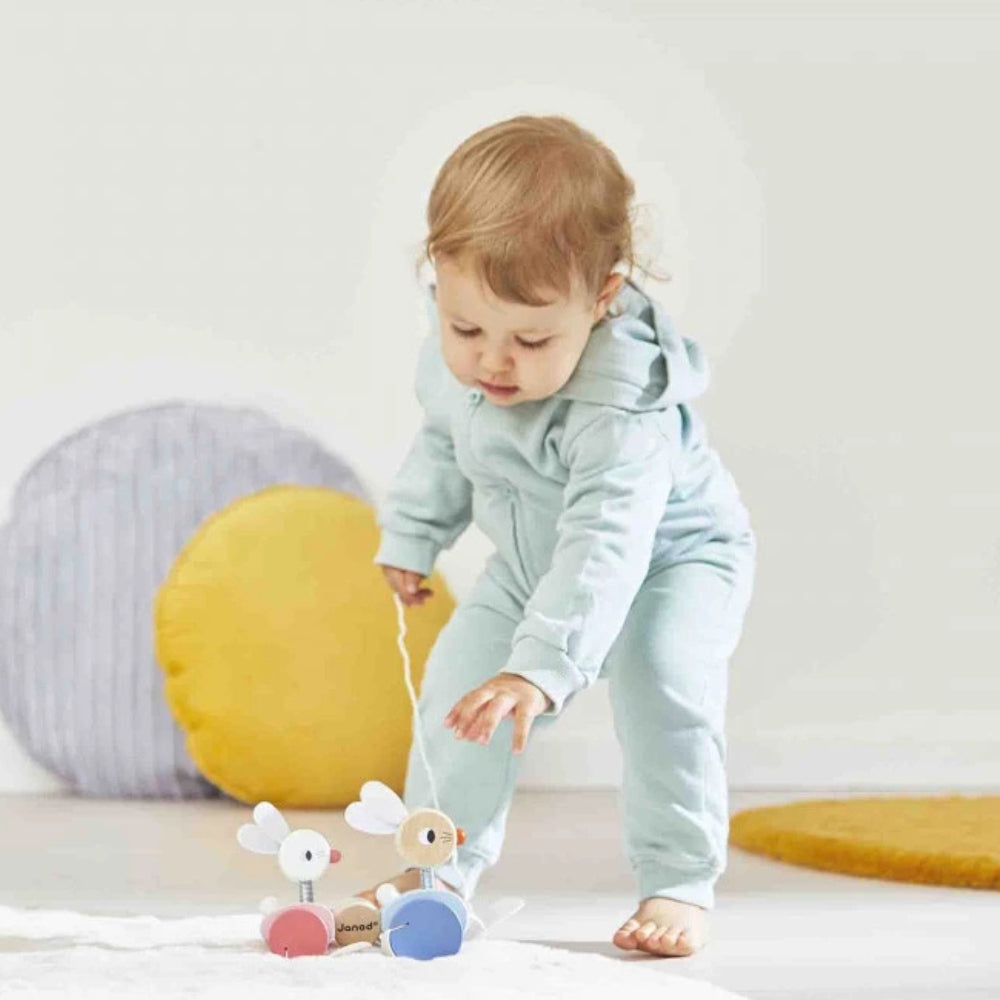 Het trekspeelgoed van Janod doet het goed thuis en tijdens wandelingen, wanneer de kleine trots zijn kleine metgezellen leidt.