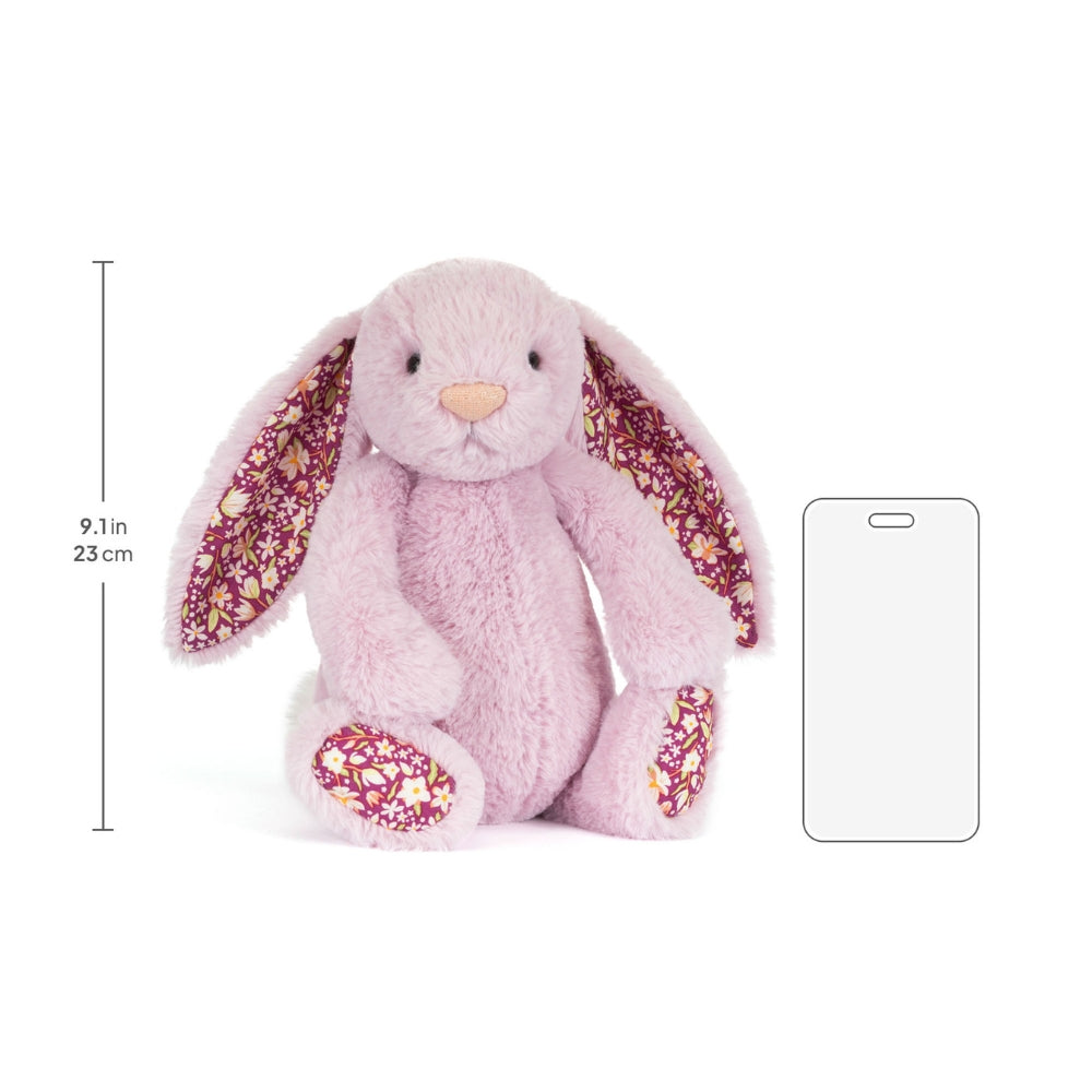 De Blushkin Blossom Luxe Bunny knuffel van Jellycat is een schattig lila konijntje met gebloemde oren dat direct aanzet tot nabijheid.