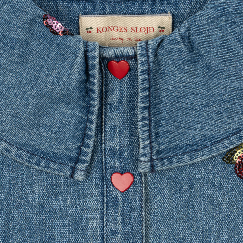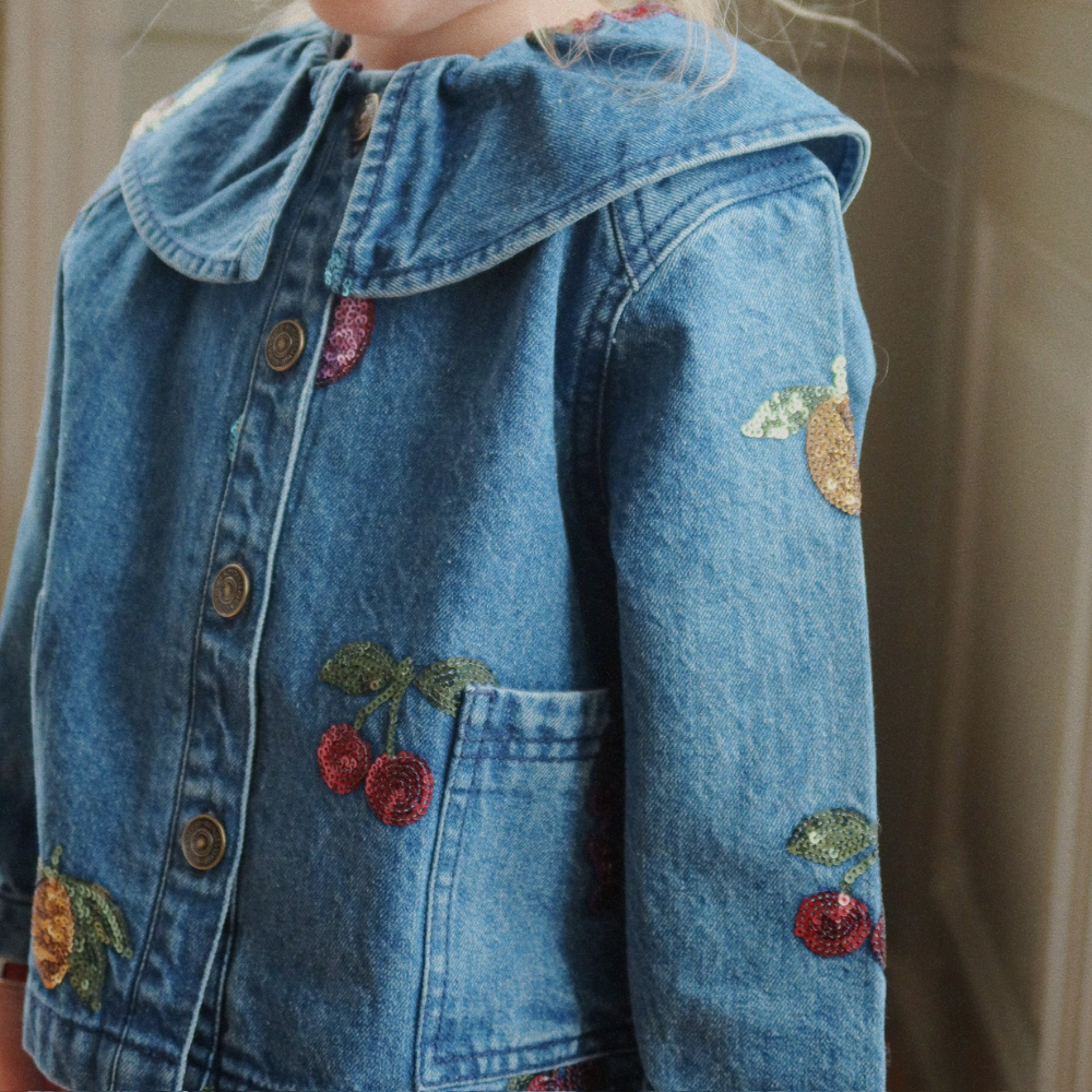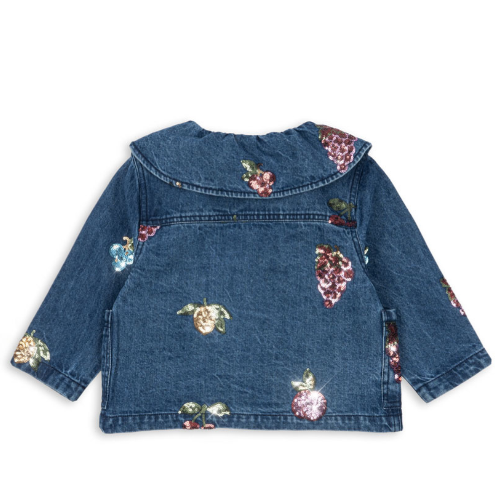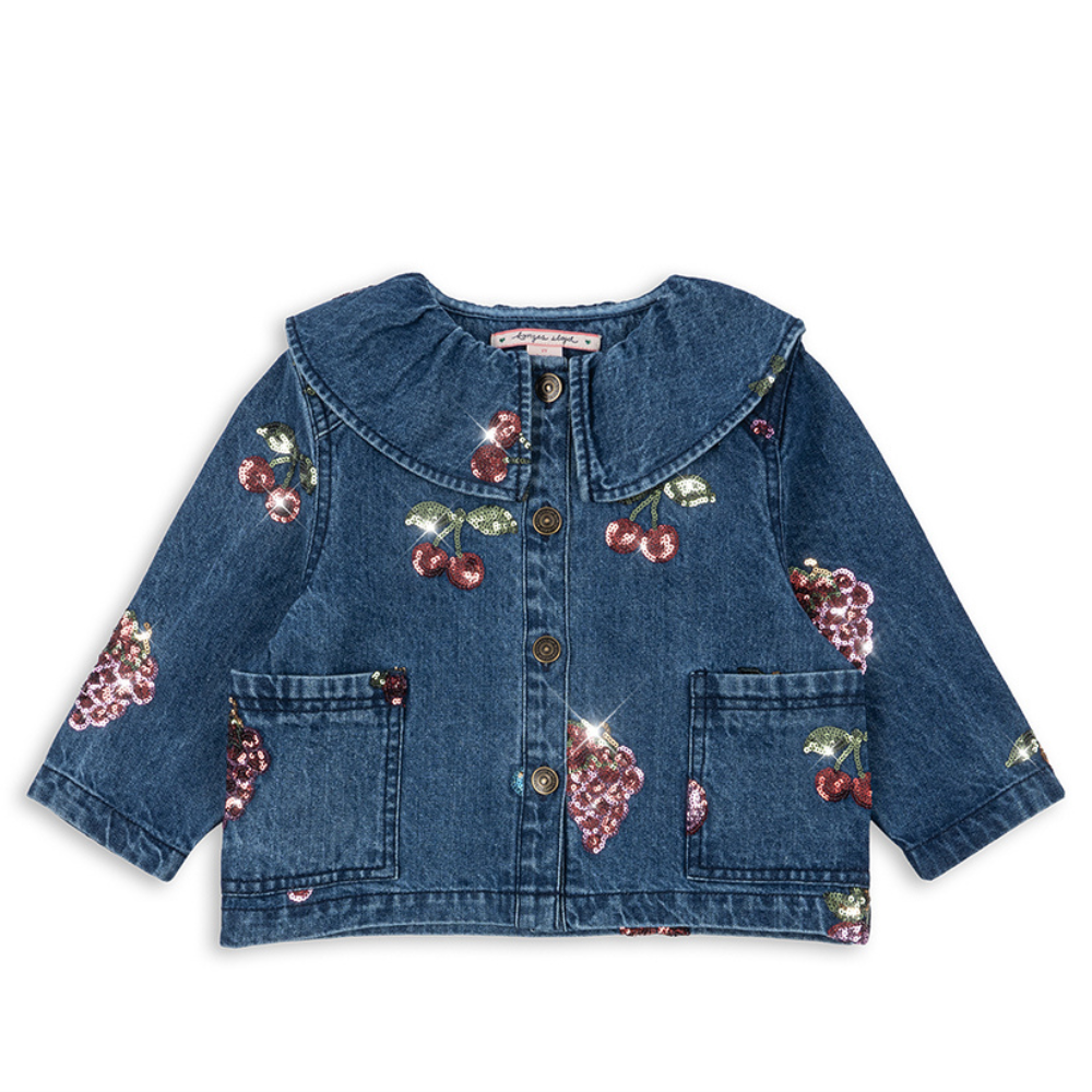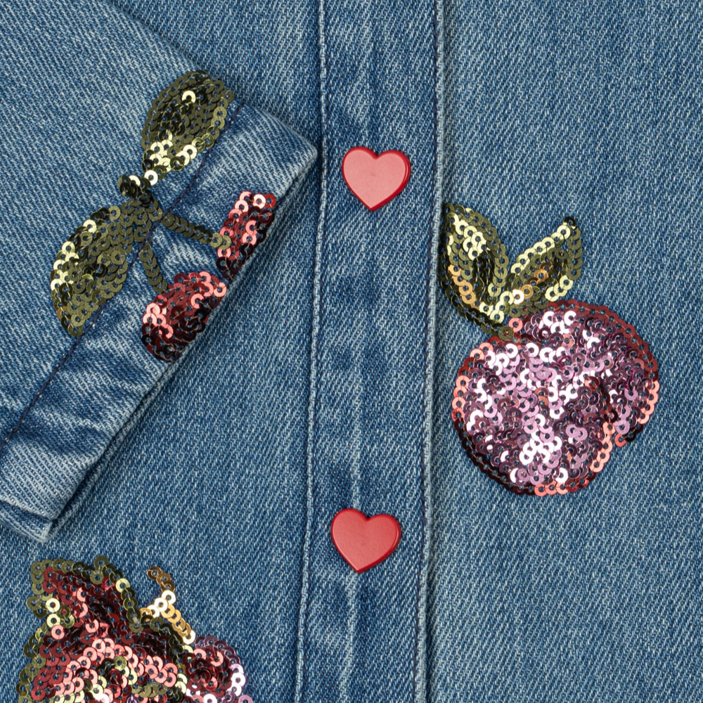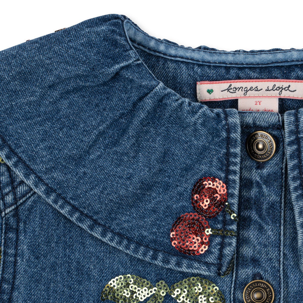 Het spijkerjasje voor meisjes van Konges Slojd is een zacht overhemd met een ronde kraag en geborduurde paillettenvruchten - perfect voor alledaags en speciale gelegenheden.