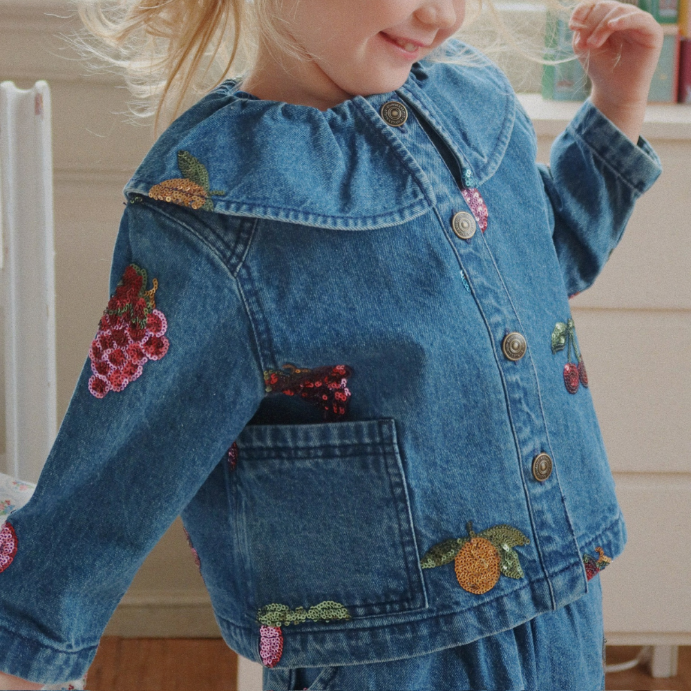 Het spijkerjasje voor meisjes combineert prachtig met jurken, leggings en T-shirts, en het glanzende fruit voegt een vleugje glamour toe.