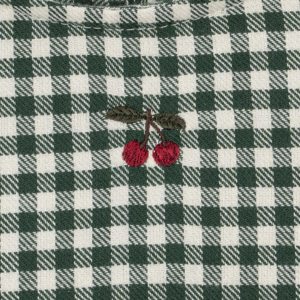 Het klassieke ruitpatroon in groen en crème voegt tijdloze charme toe, terwijl de geborduurde kers op de voorkant een subtiel kenmerkend detail van het merk is.